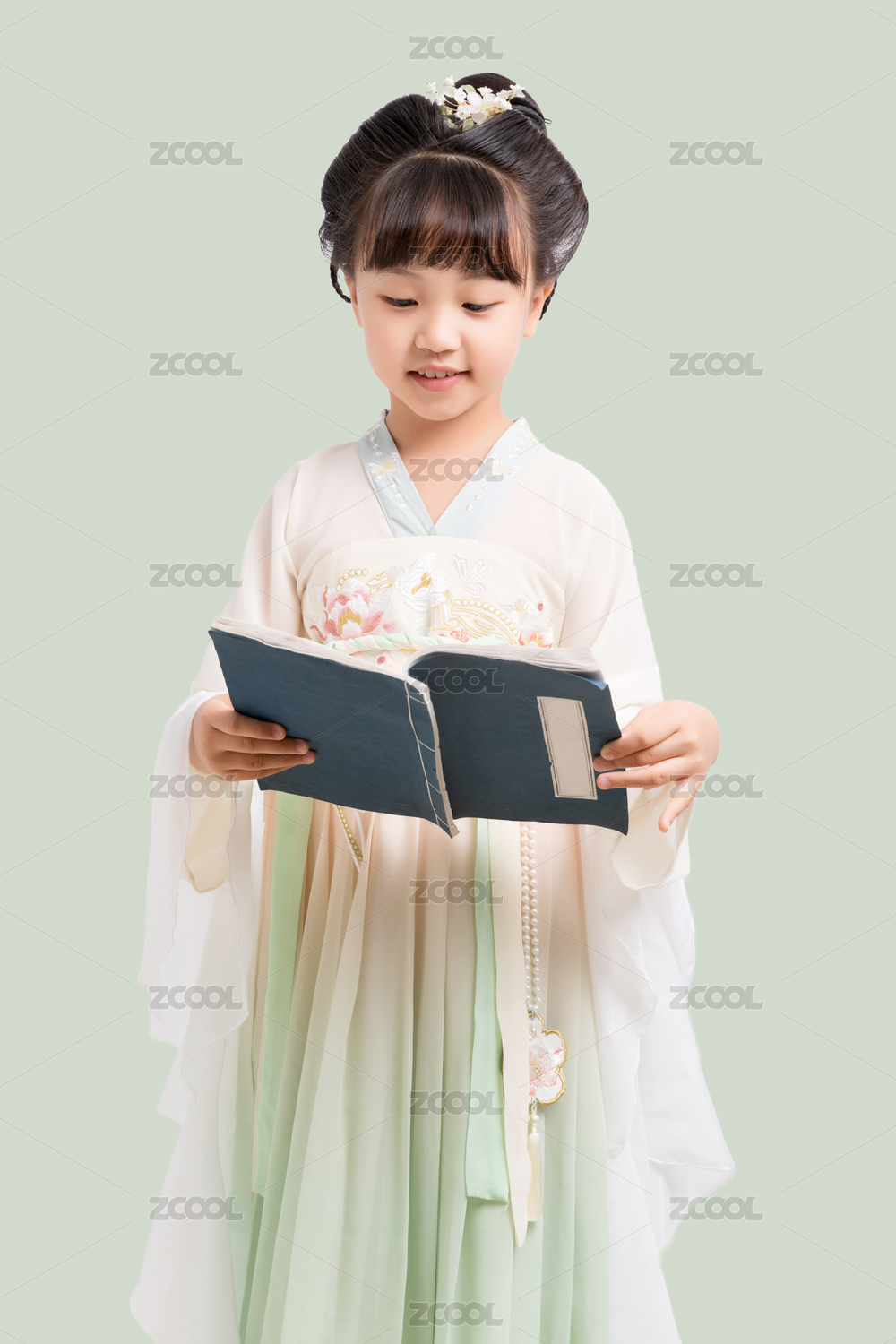 身穿中国古典唐装手拿古书的小女孩棚拍肖像