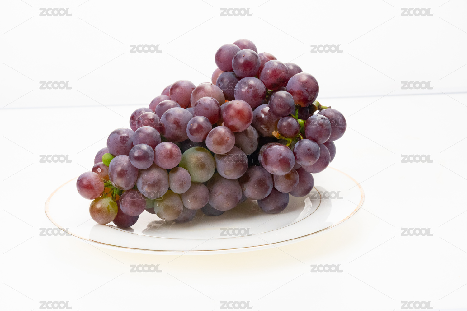 盛放在白色瓷盘里的紫色青色的巨峰葡萄
