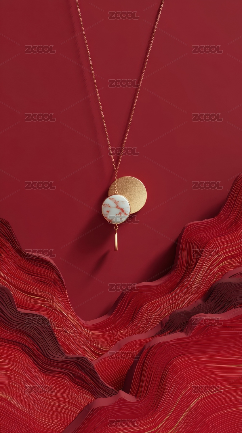 红色背景下的金色项链与吊坠