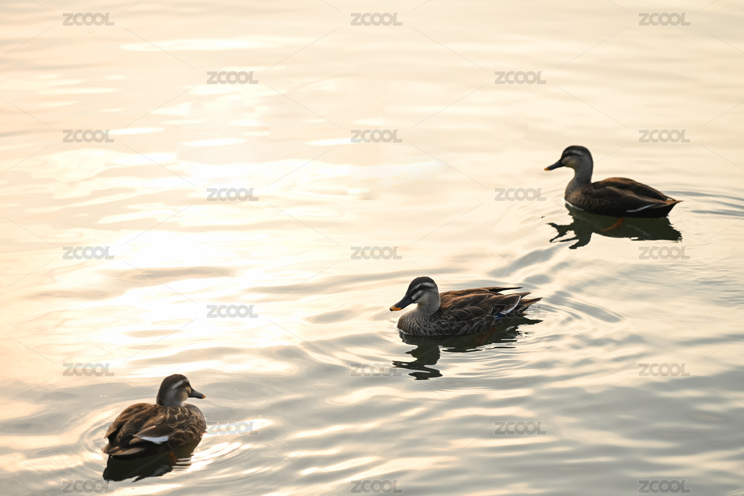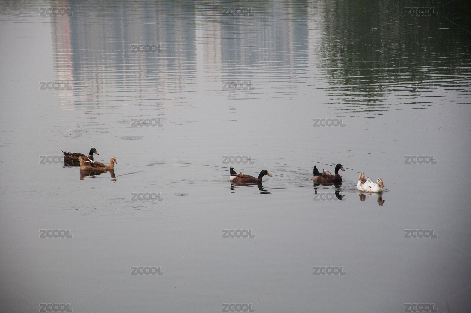 一群鸭子在湿地公园里的湖面上游泳嬉水