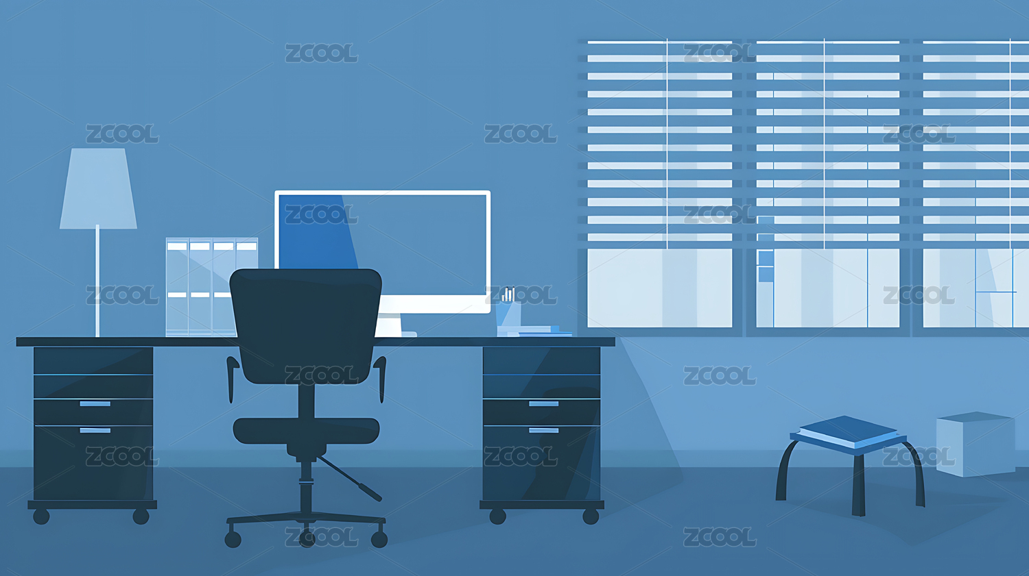 蓝色办公室带有电脑文具椅子等办公用品矢量图