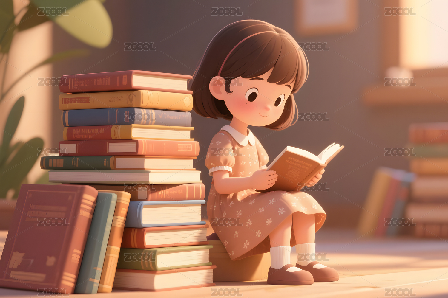 坐在书籍上认真看书的双马尾小女孩
