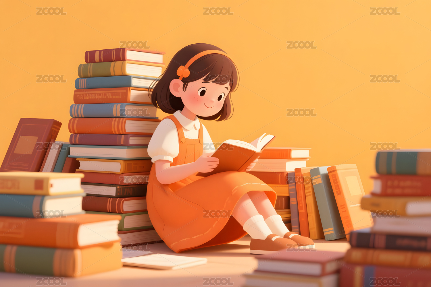 小女孩坐在书堆边认真看书