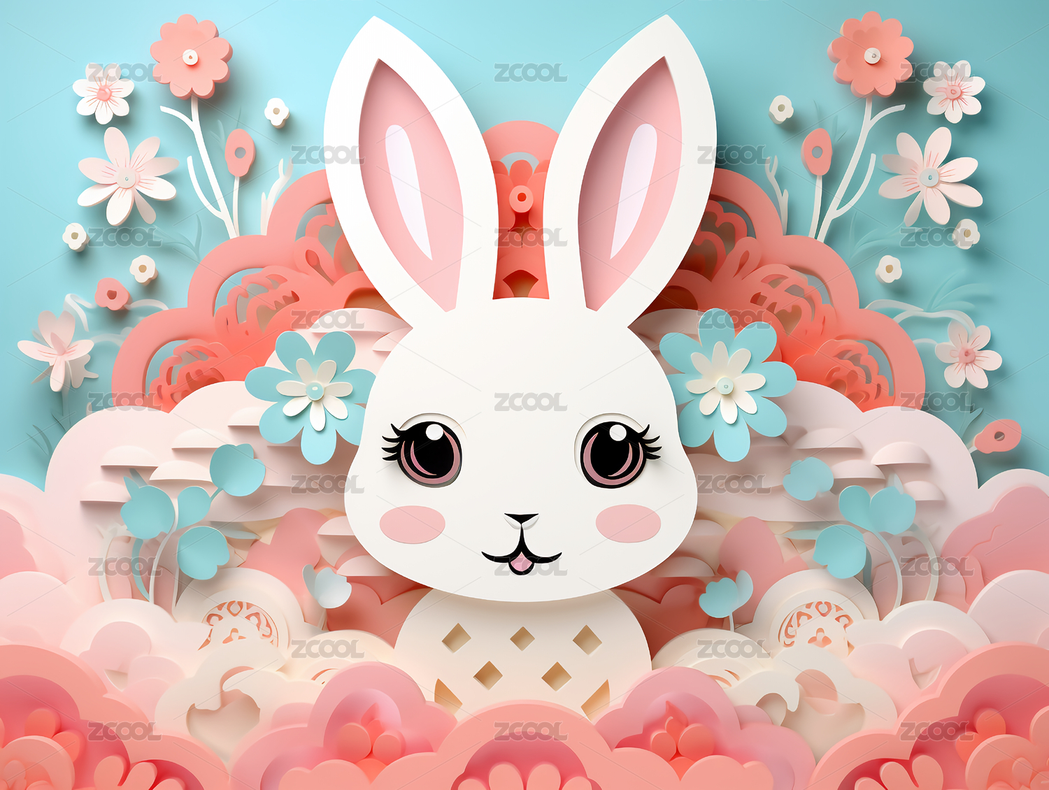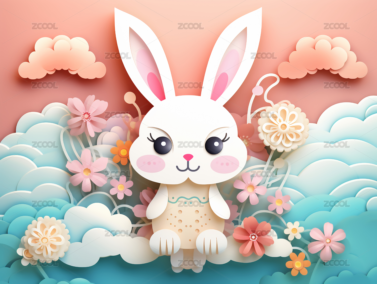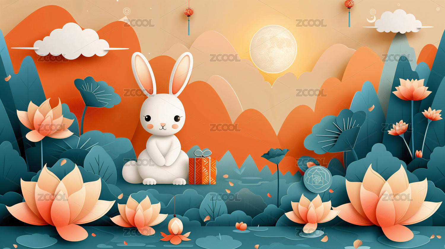 可爱兔子手捧月饼,采用彩色剪纸风格设计.