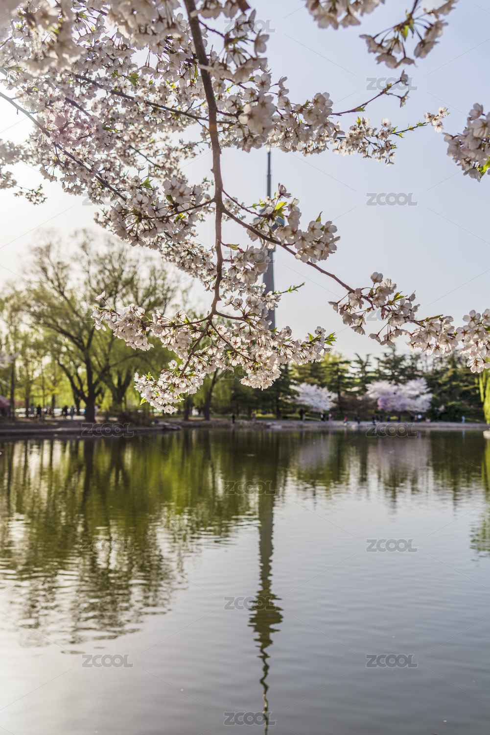 春日里中国北京市玉渊潭的樱花绿树和水中的倒影
