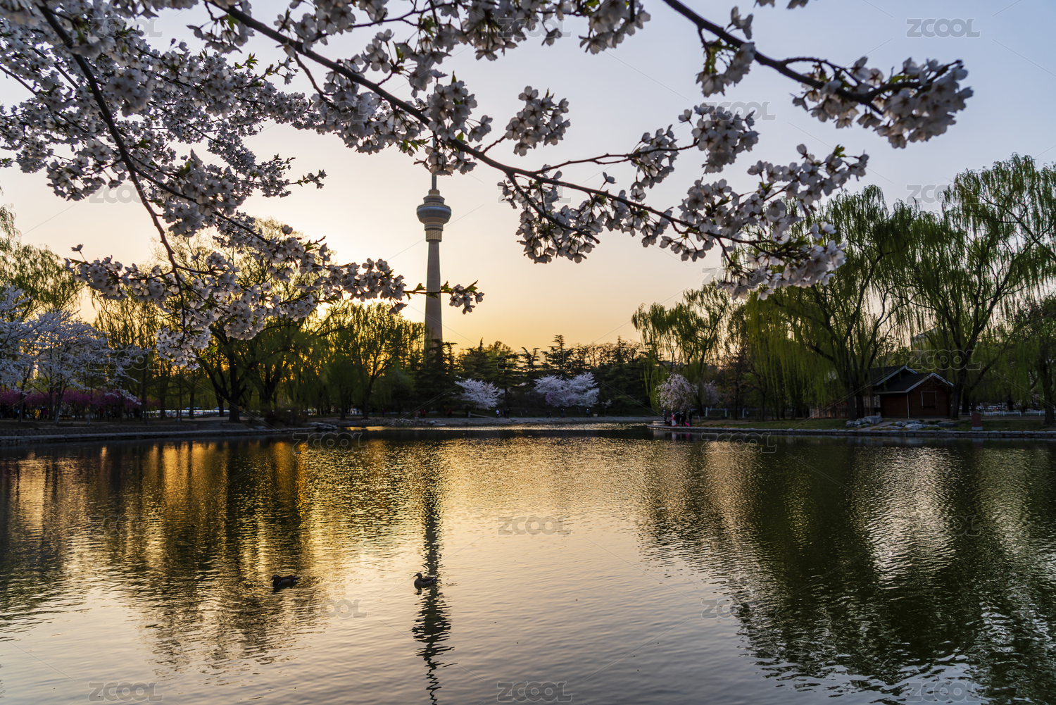 春天傍晚北京玉渊潭樱花掩映的电视塔