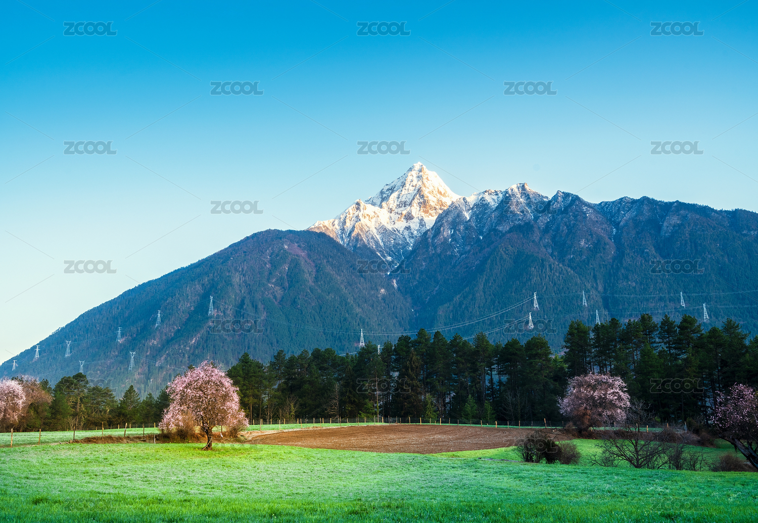 中国西藏林芝春天桃花雪山田野