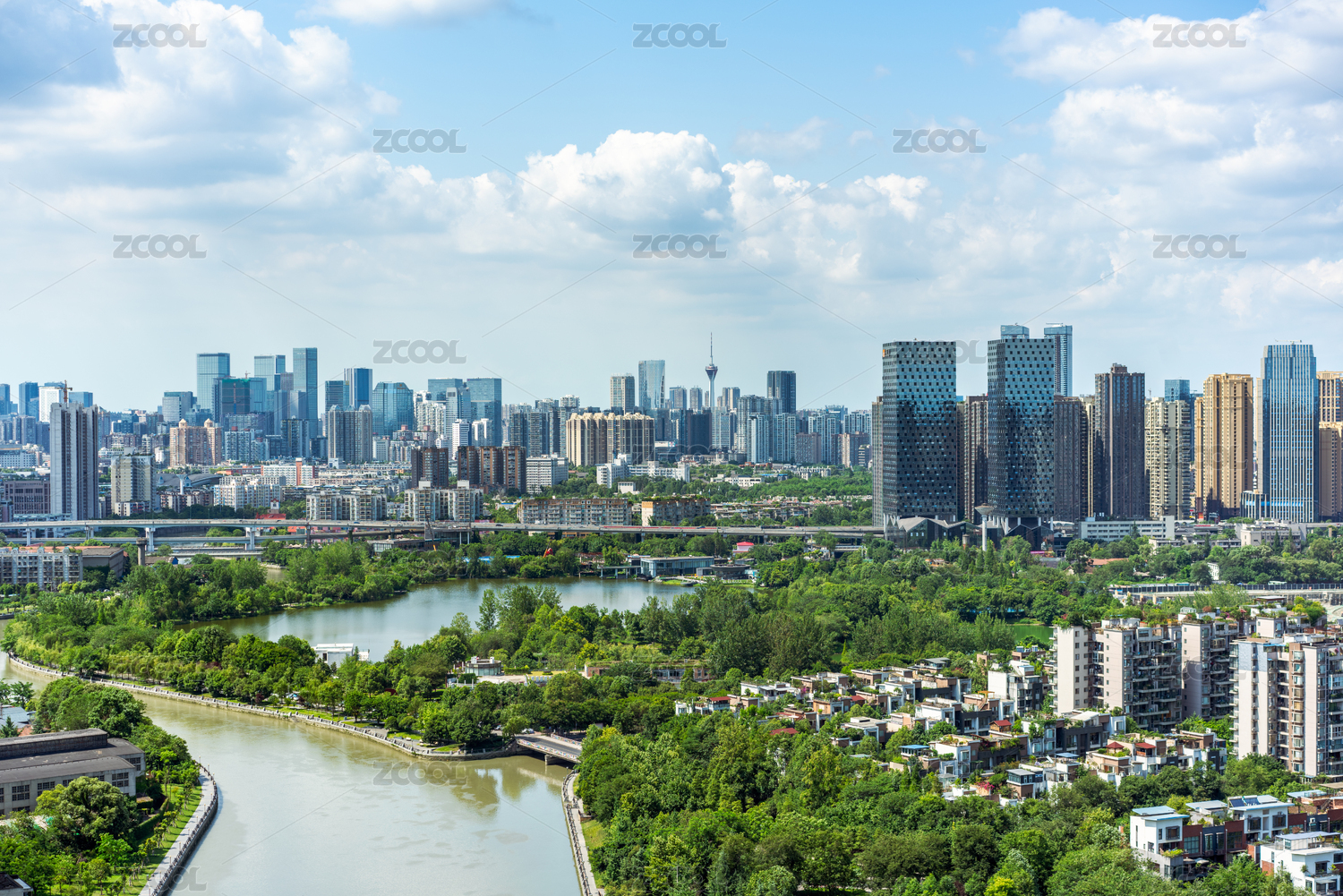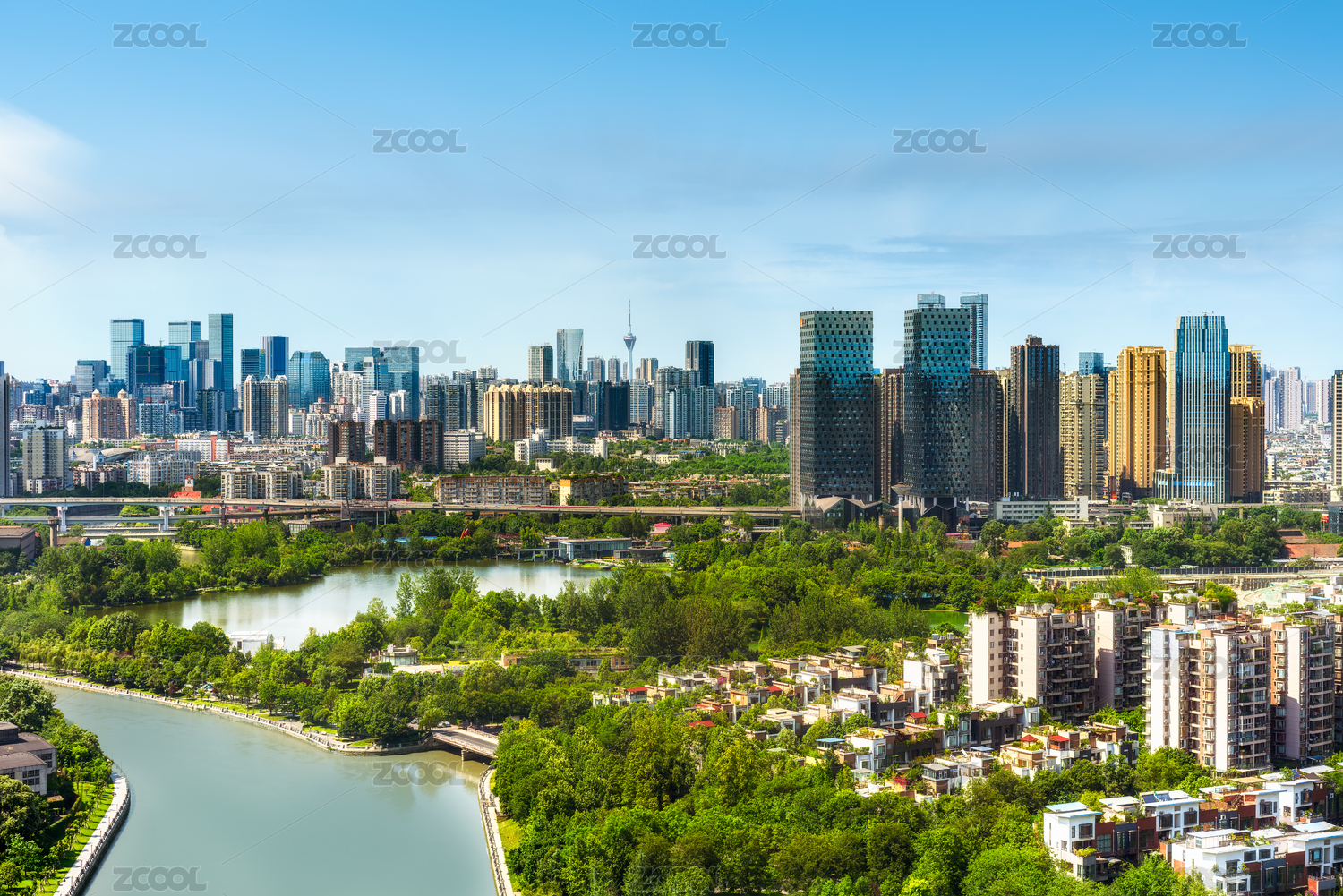 中国四川省成都市东湖湿地公园及市中心现代建筑远景图