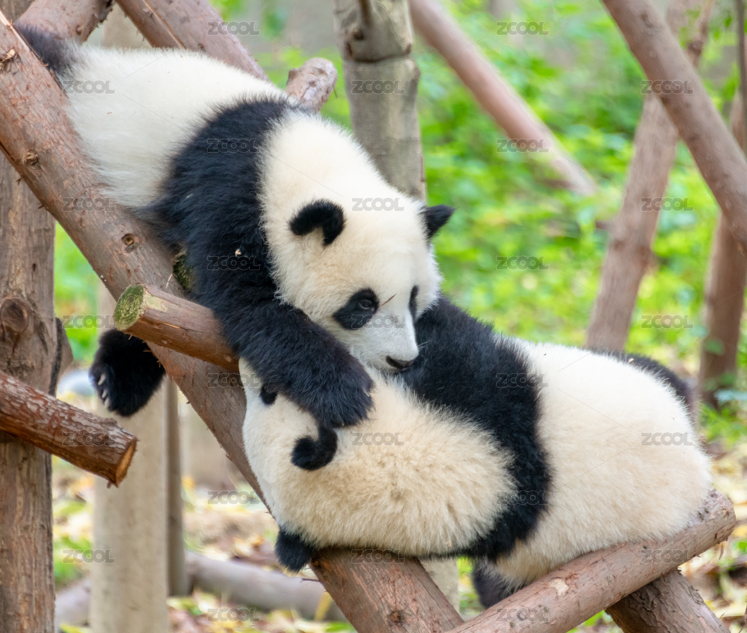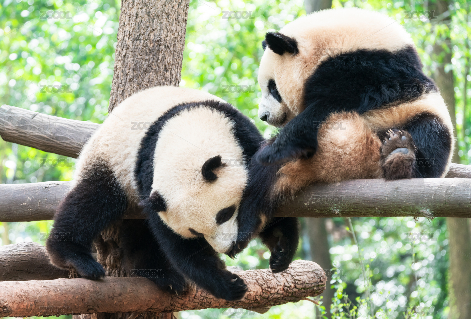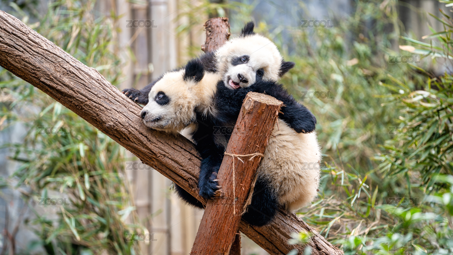成都大熊猫繁育研究基地两只大熊猫幼崽玩耍