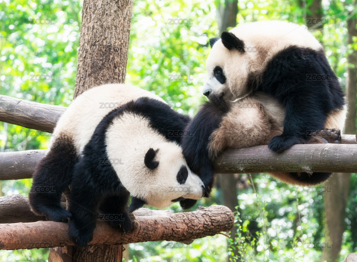 成都大熊猫繁育研究基地的两只大熊猫玩耍