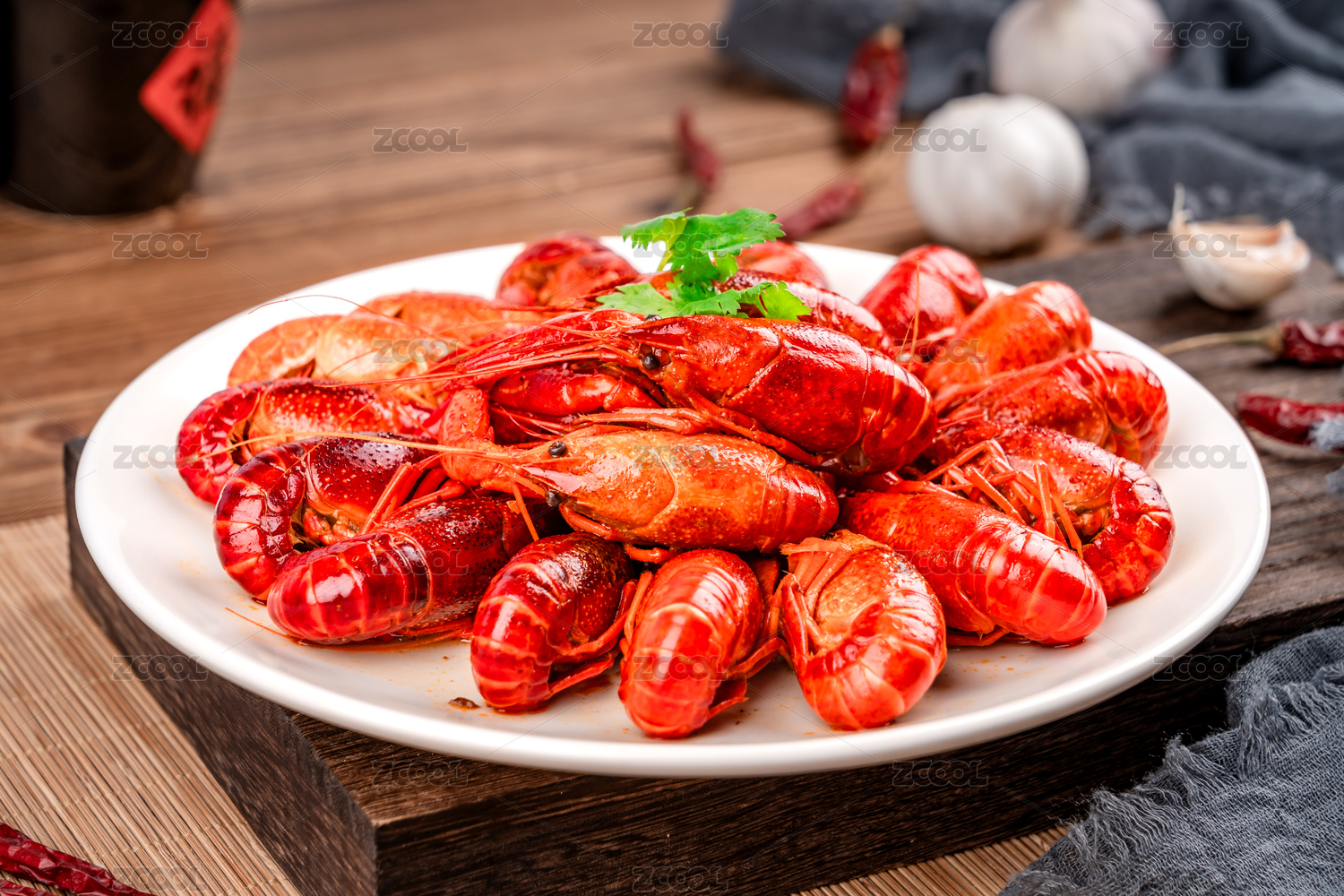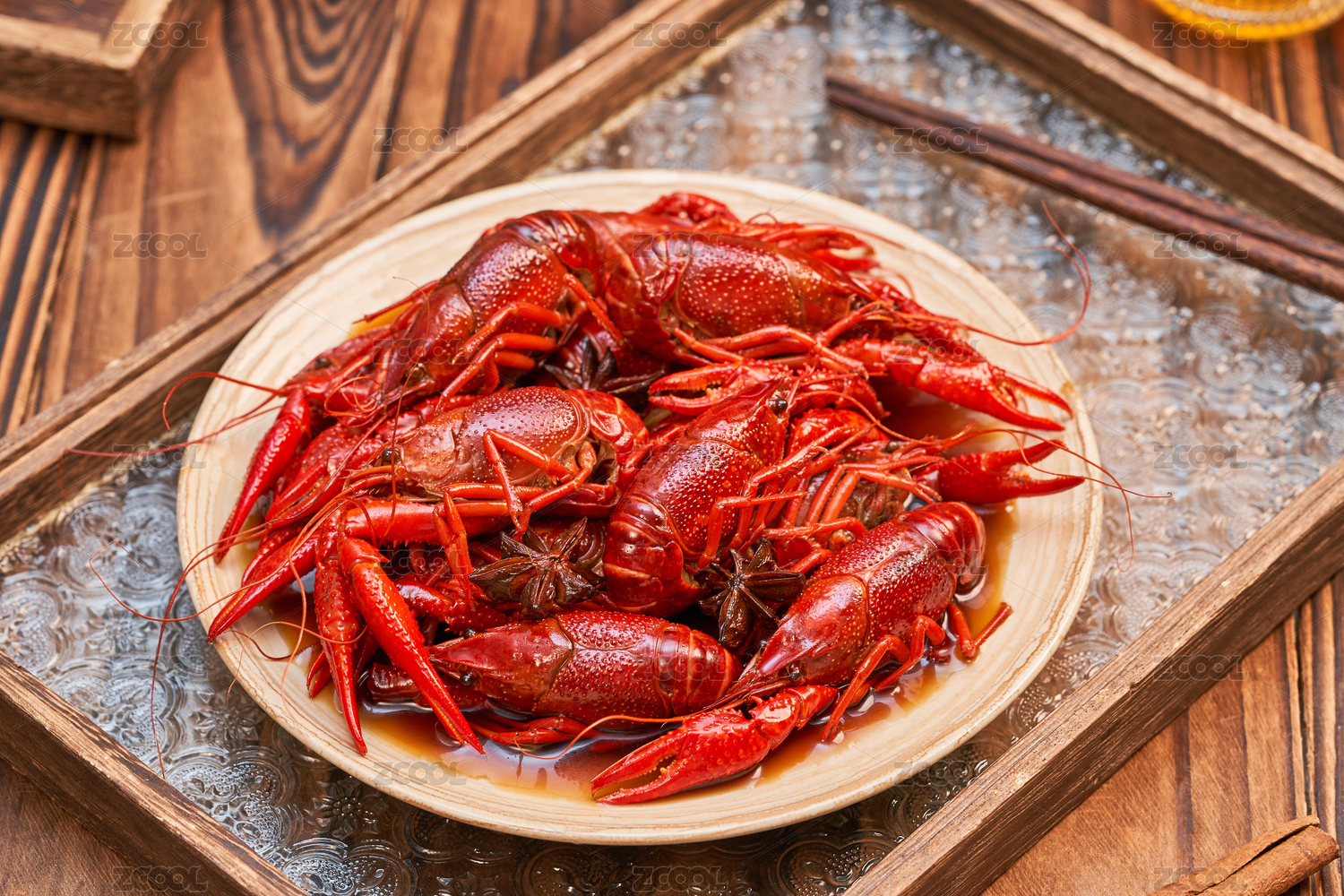 木板背景上满满一盘麻辣小龙虾