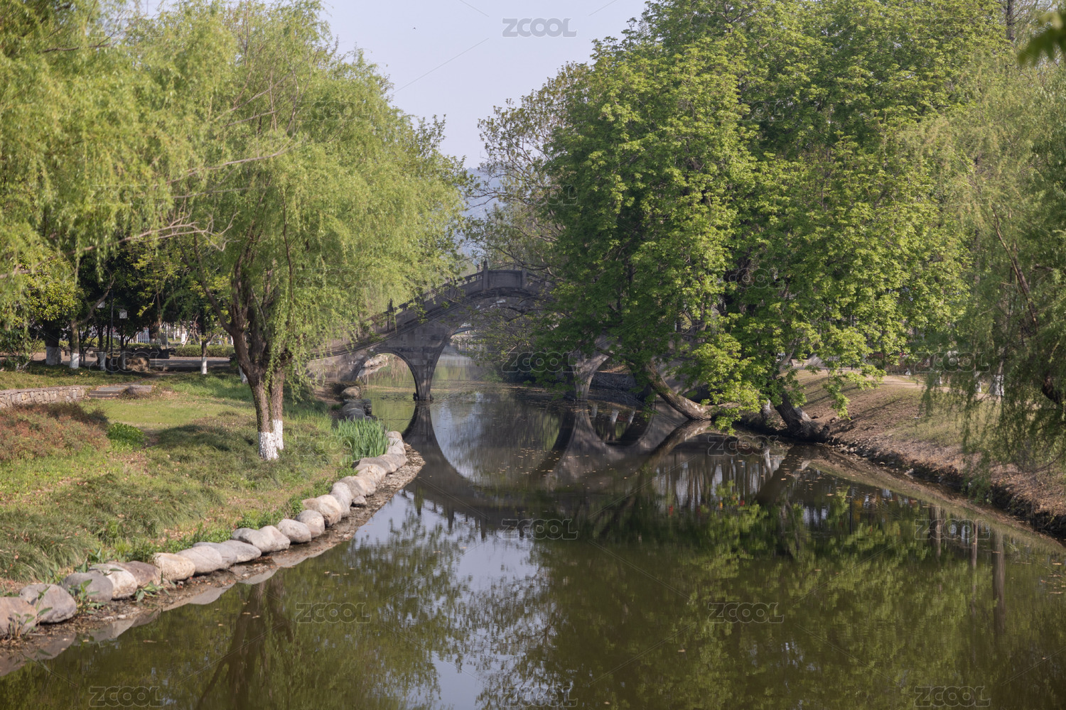 公园拱桥垂柳自然风光