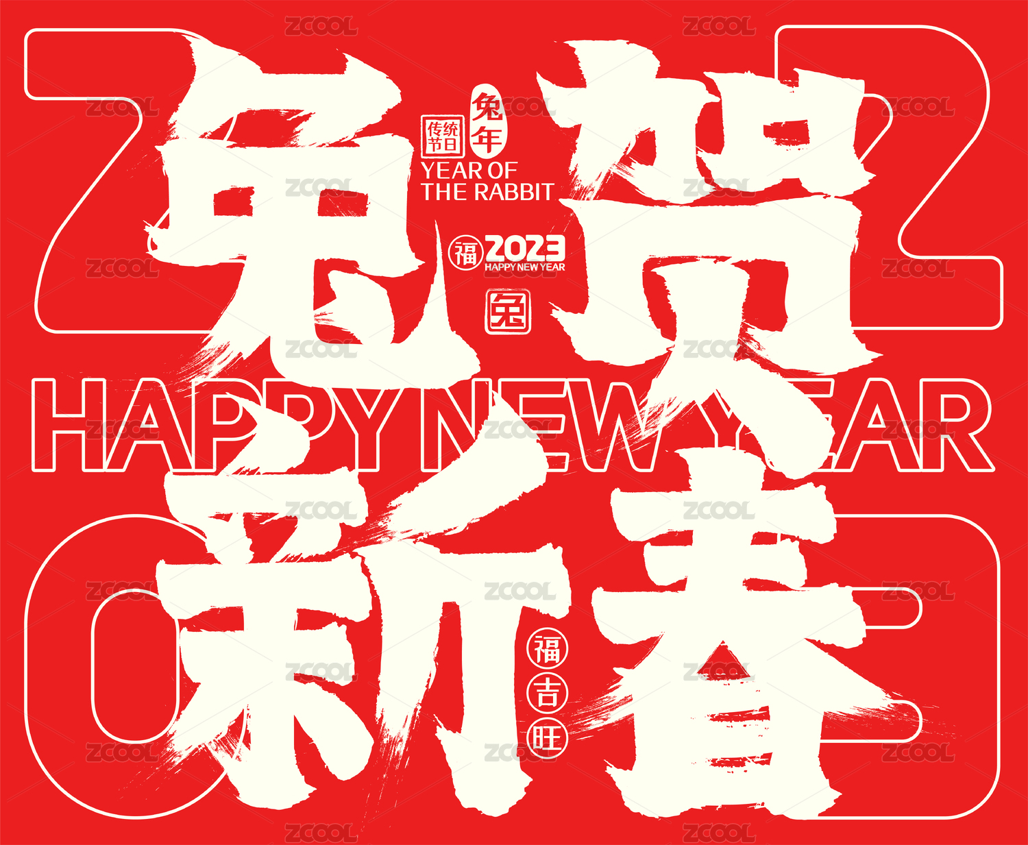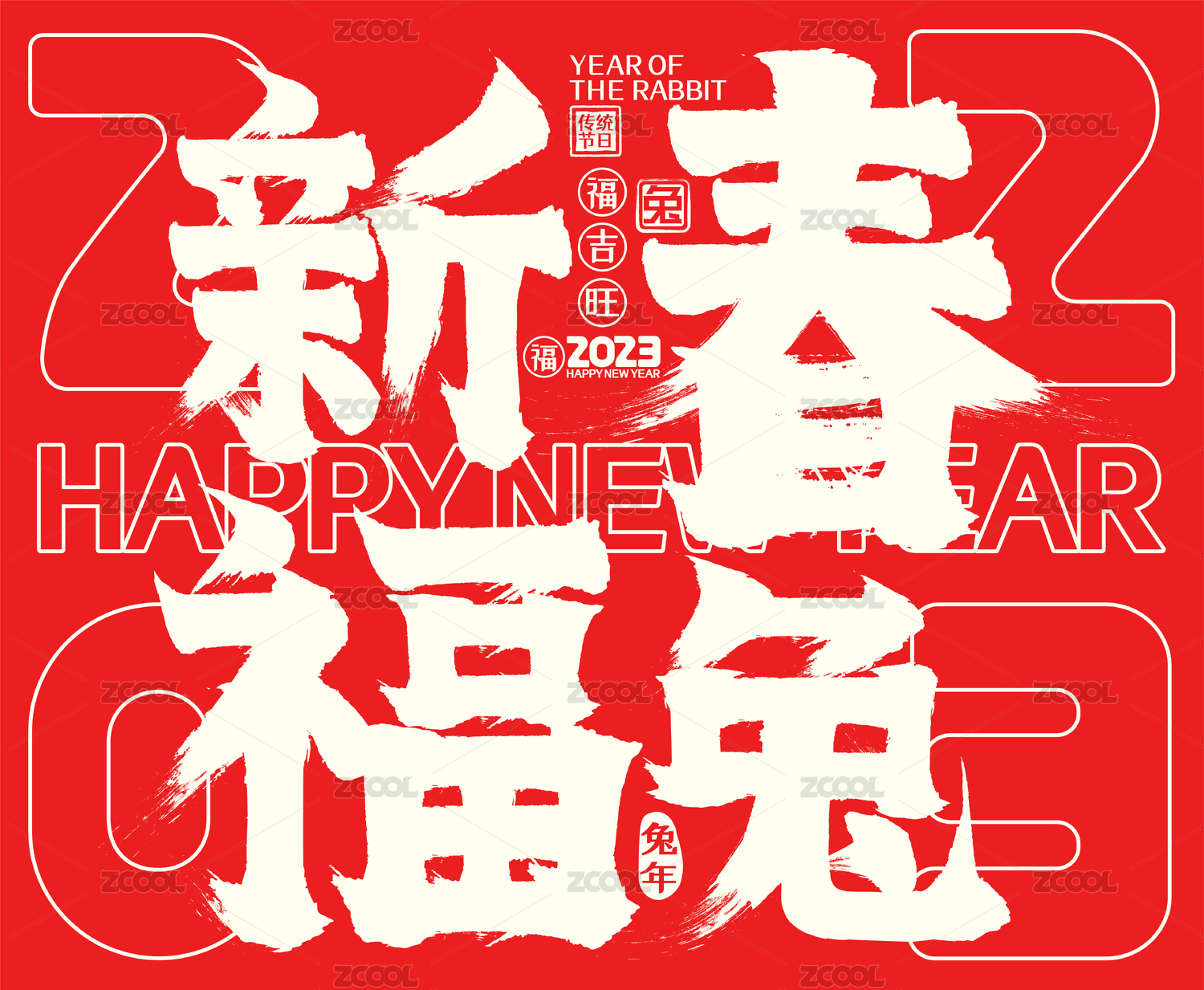 2023兔逢新春喜庆中国红兔年春节毛笔字