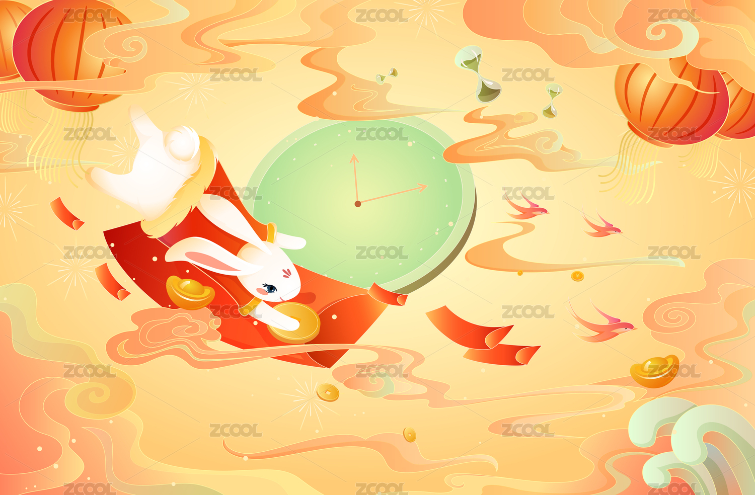 穿汉服的兔子拿着福字坐着鞭炮飞向空中