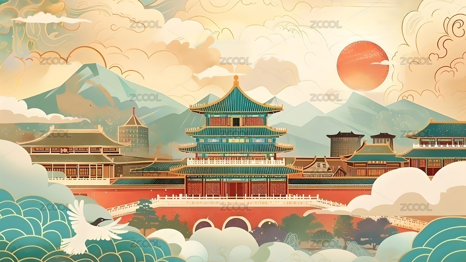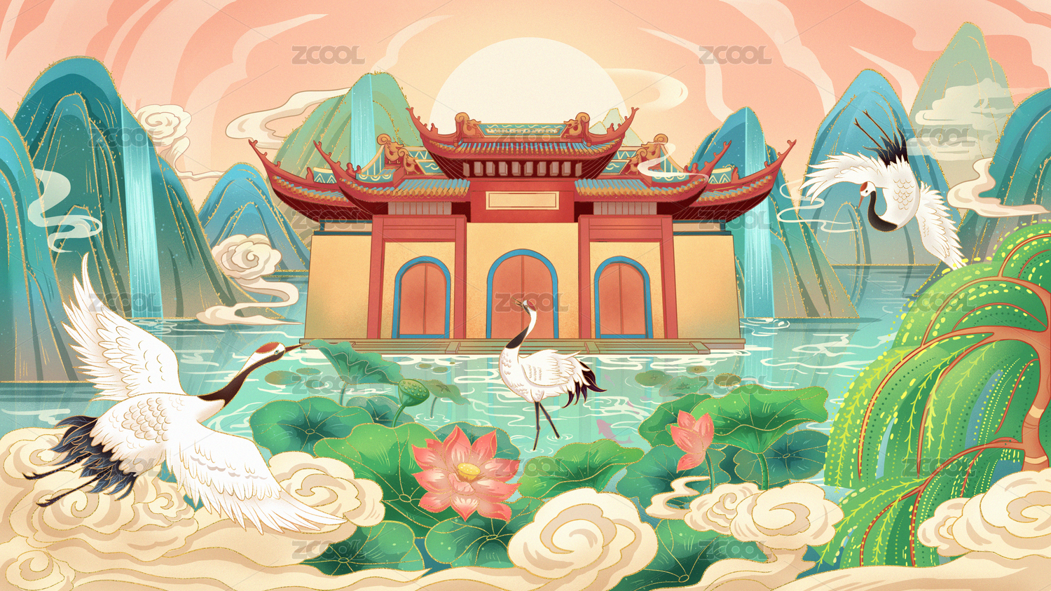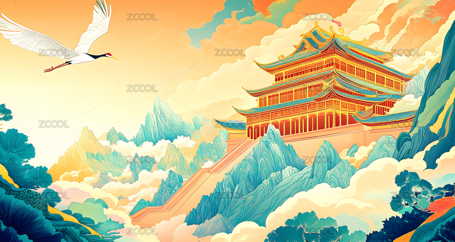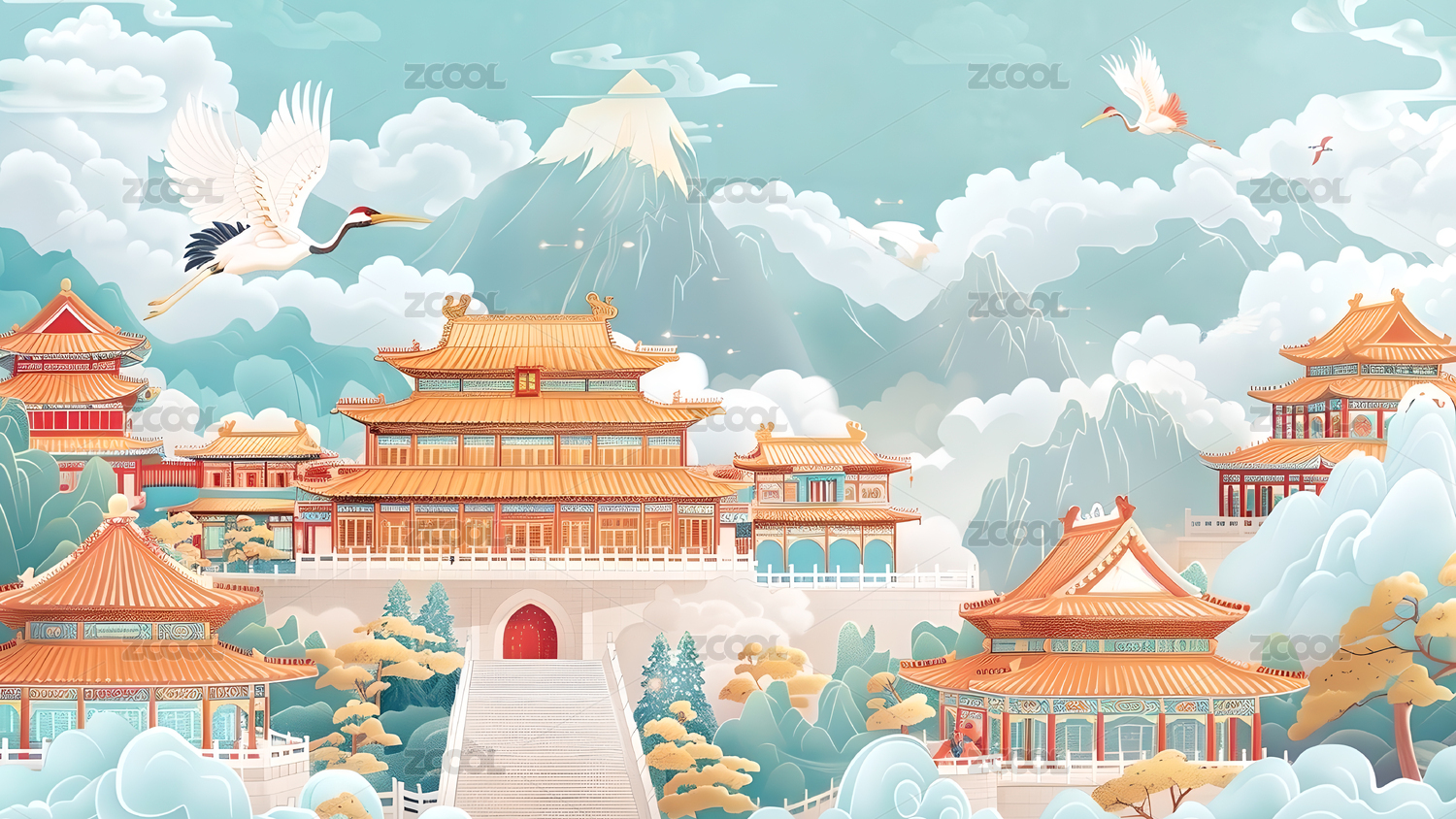 国潮风格中式古代建筑宫殿仙鹤飞远山祥云