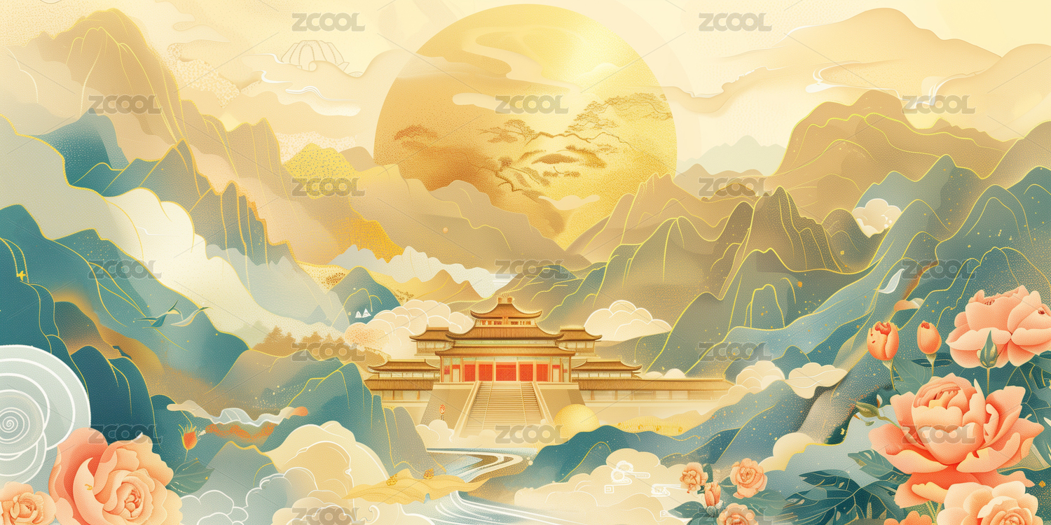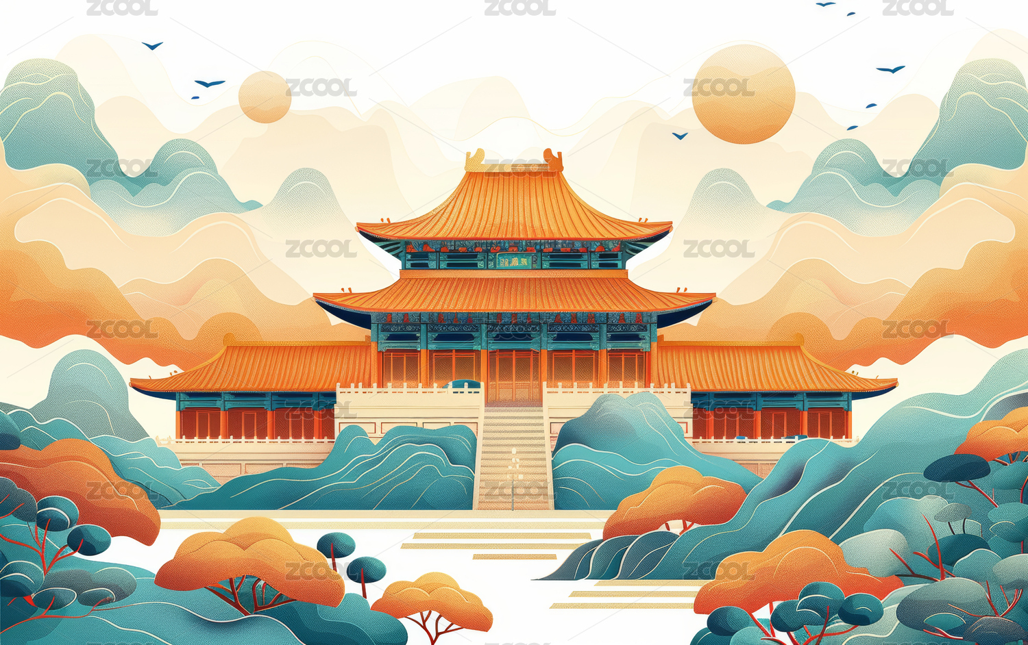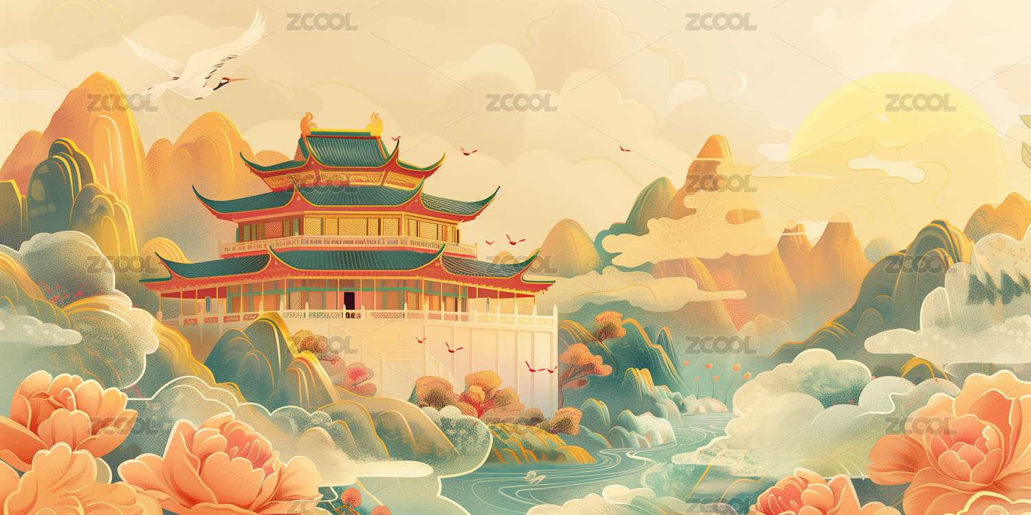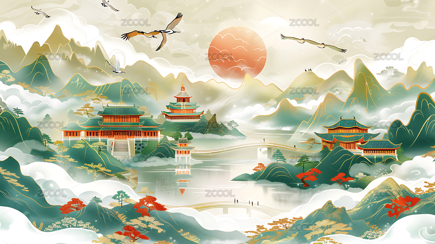 国潮风格中式古代建筑宫殿仙鹤飞远山祥云