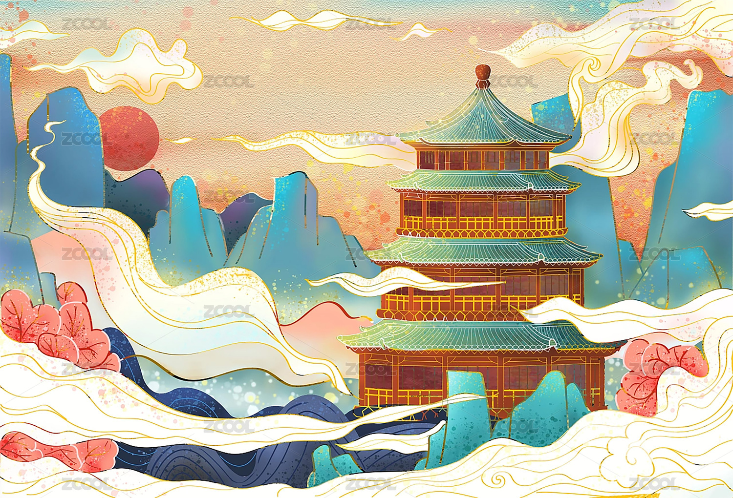 国潮风格中式宫殿塔楼古代建筑物国风古风