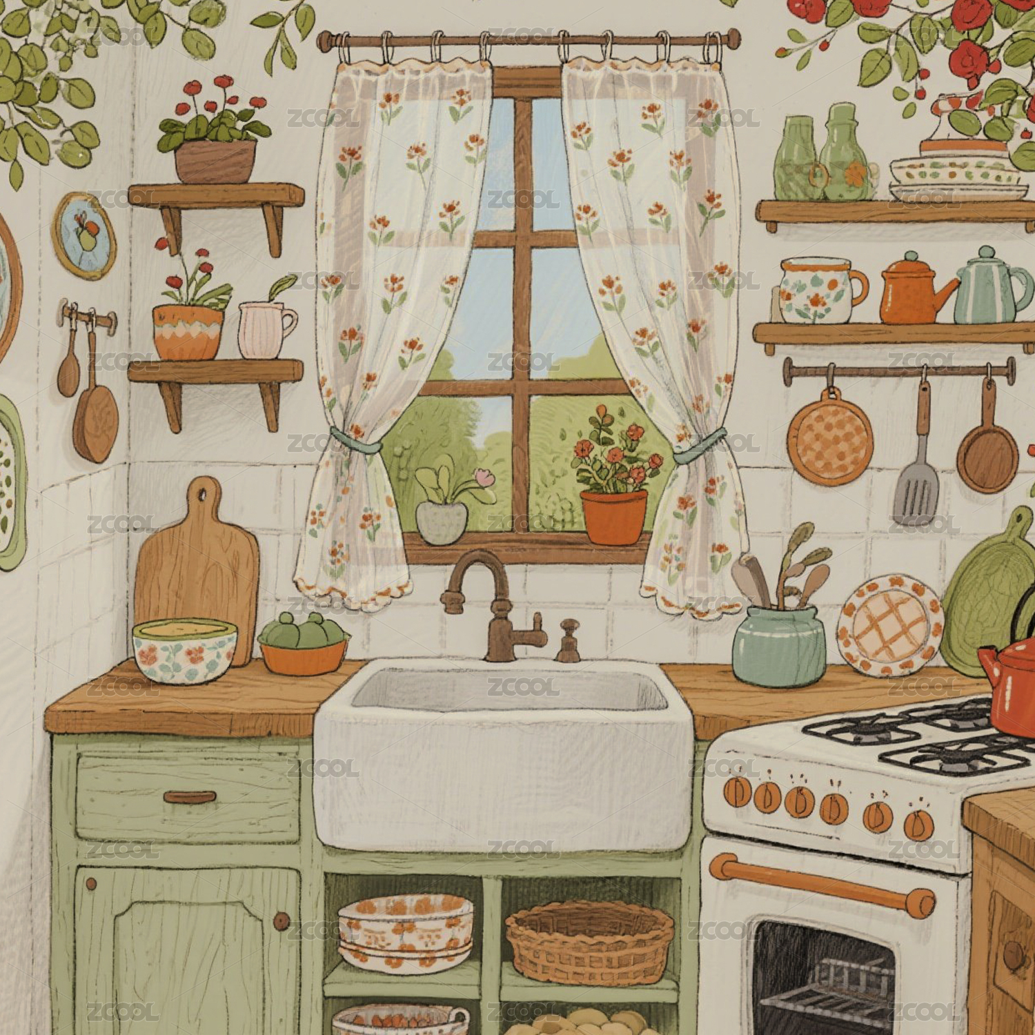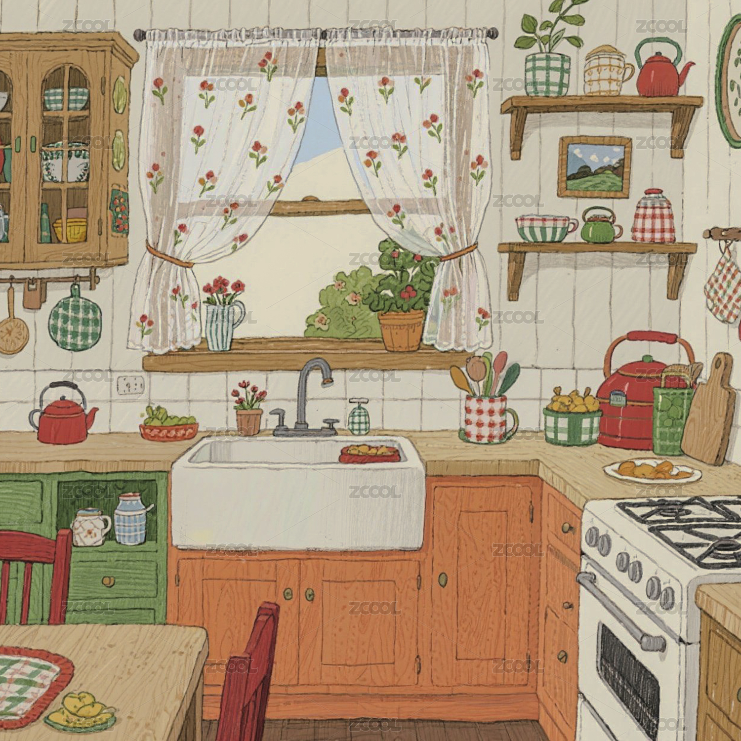 厨房,插画,温馨,治愈,清新,明亮,植物,绿色,家居,灶台