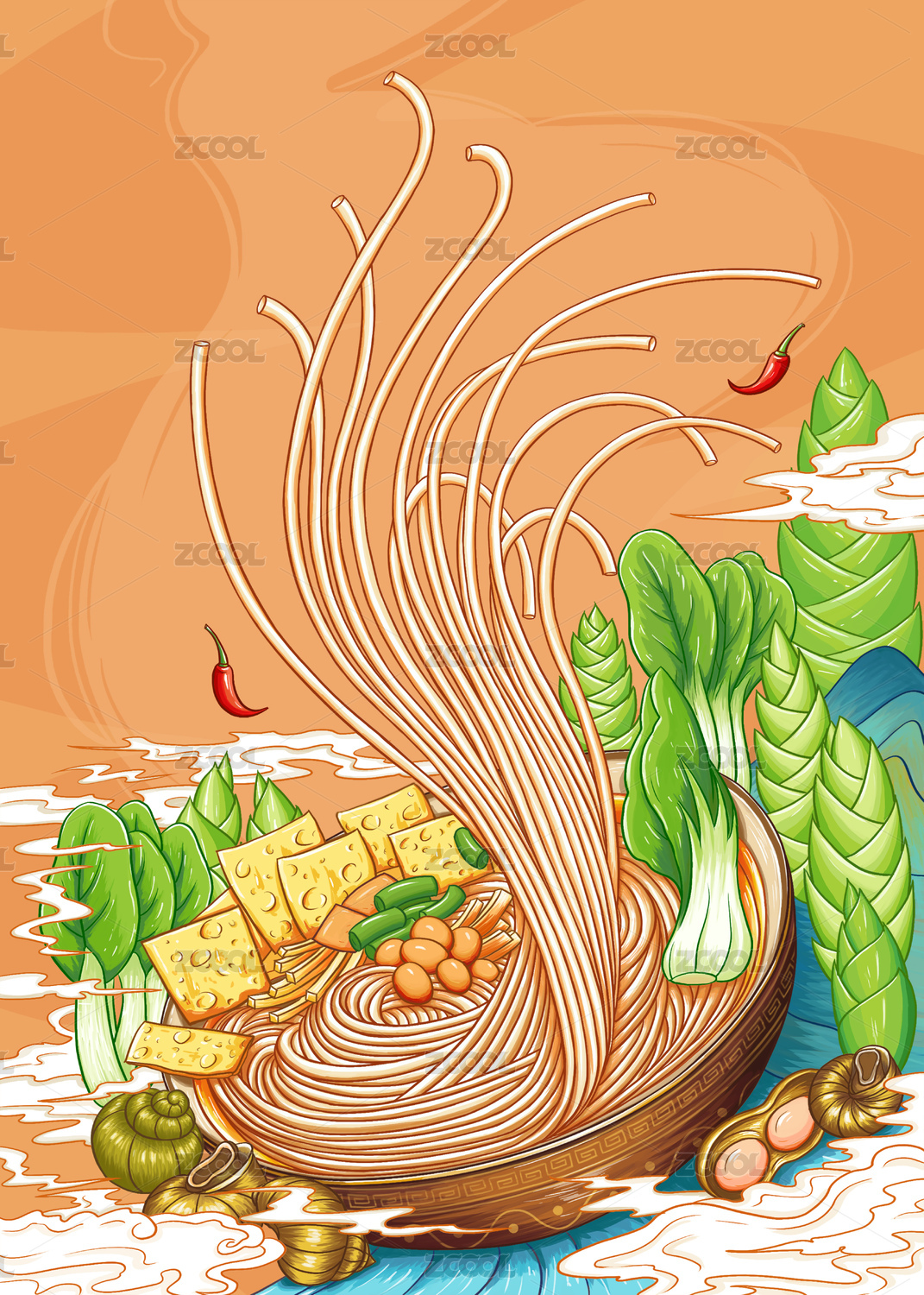 螺蛳粉,包装,国潮,鸡蛋,嗦粉,花生,插画
