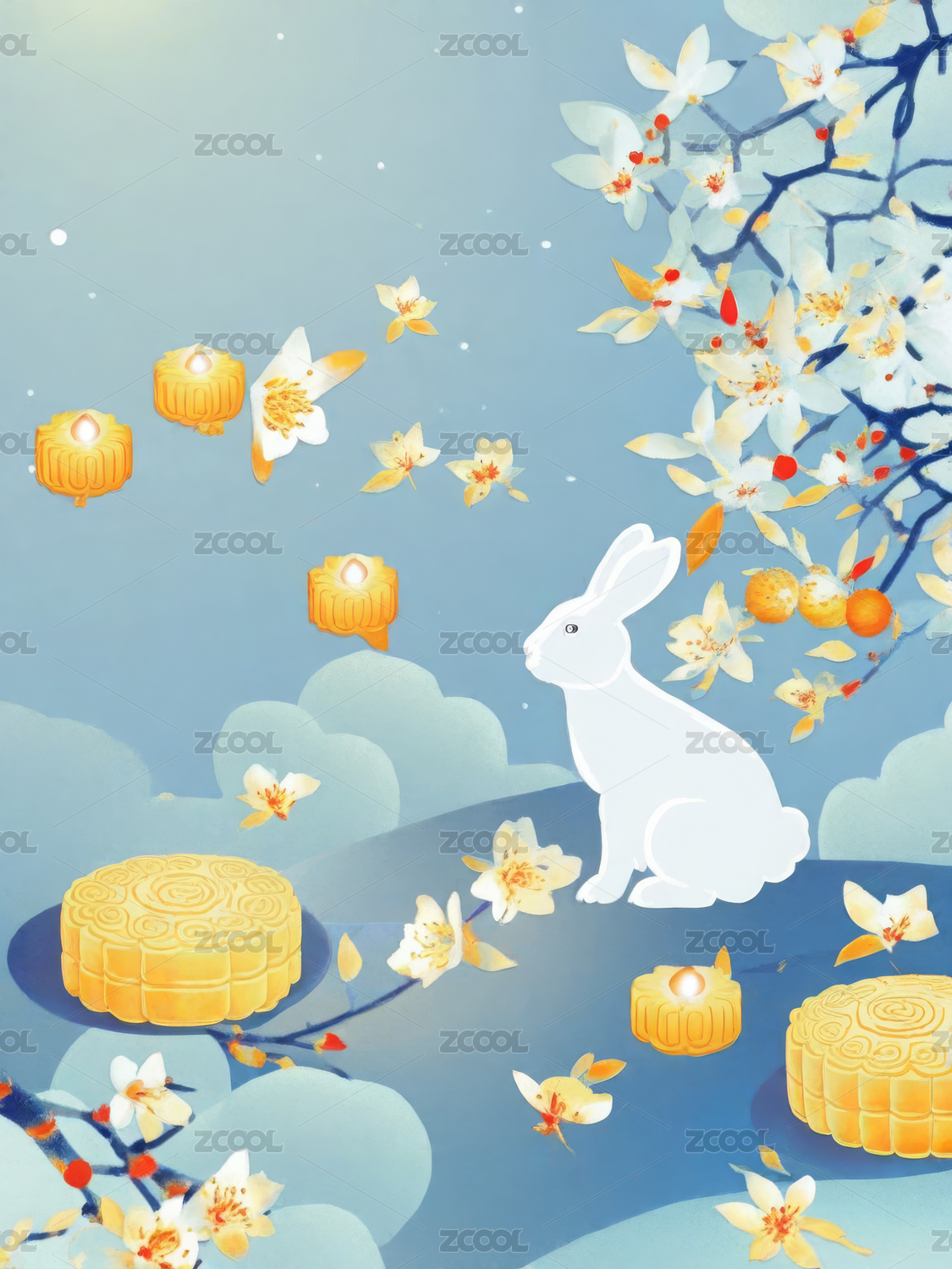 中秋节,AIGC202403,玉兔,月饼,插画,桂花