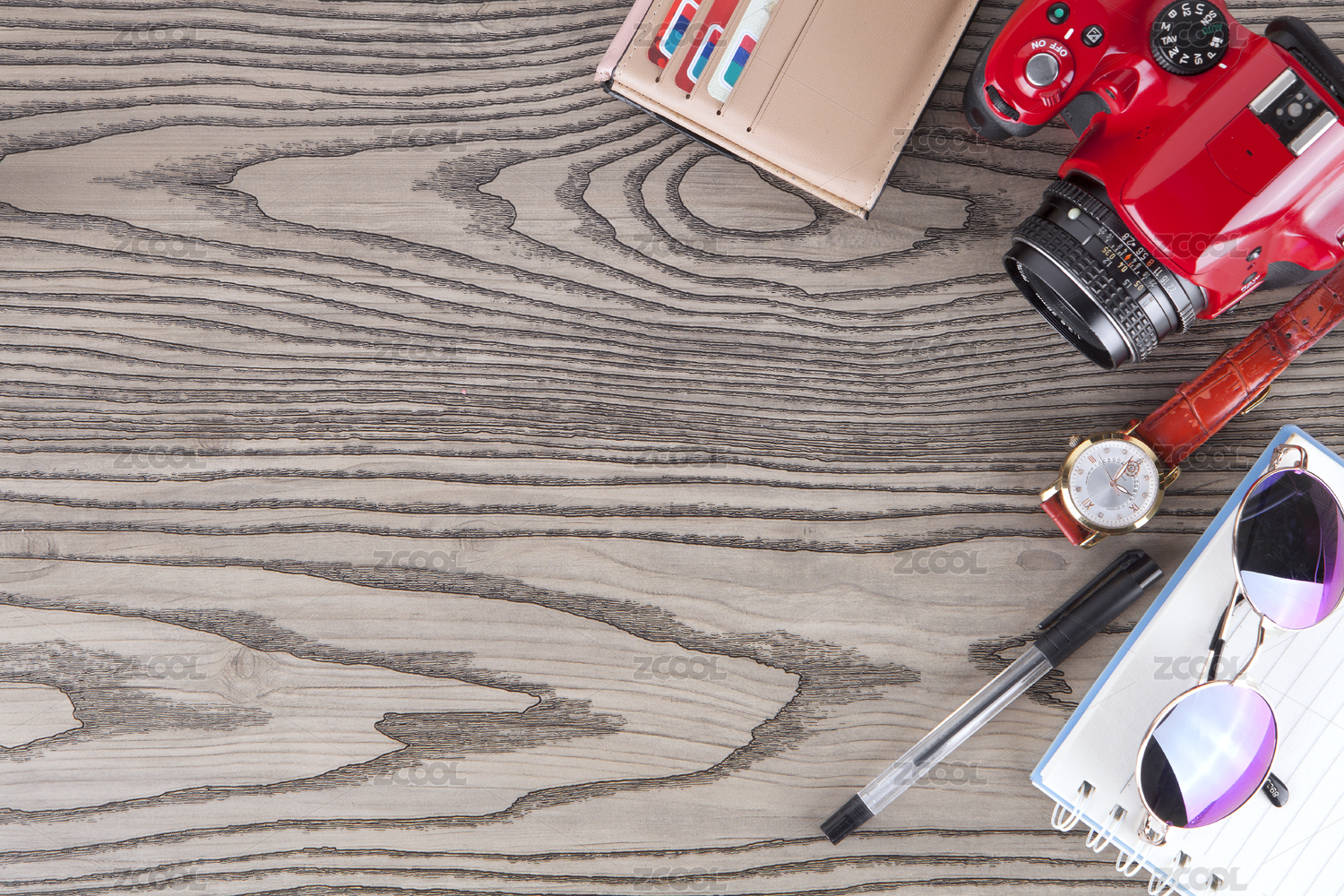 木纹背景上放着相机和办公用品