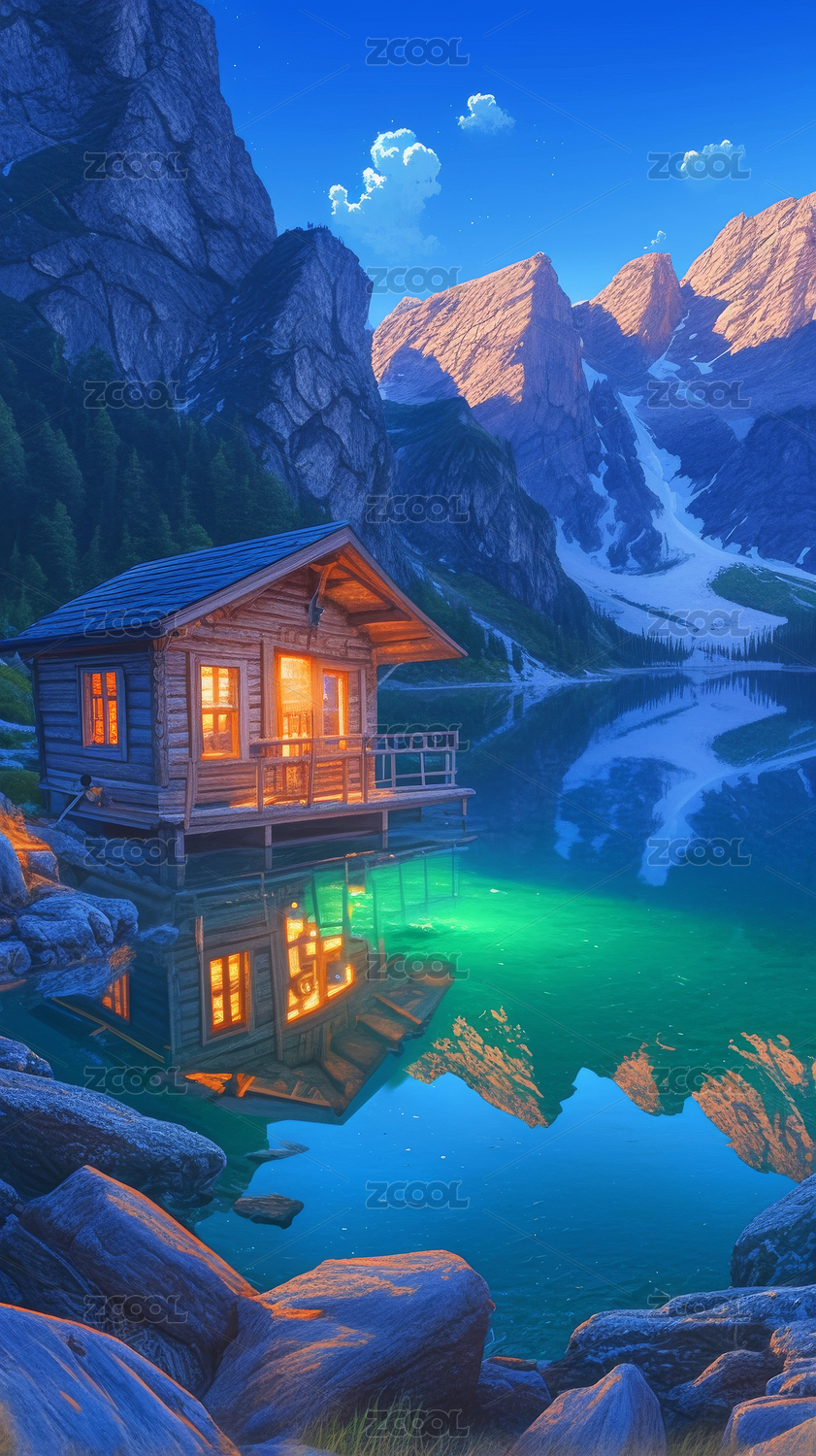湖畔小屋的静谧之夜 山间小屋的温馨灯火