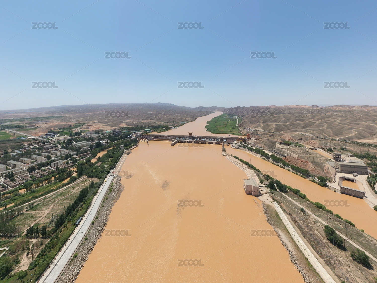 中国宁夏吴忠青铜峡黄河水利枢纽航拍