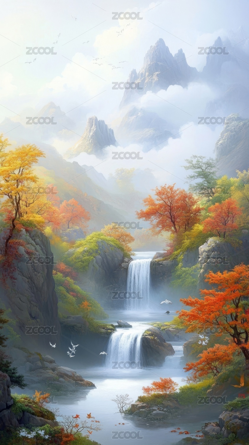 秋色瀑布山谷景色