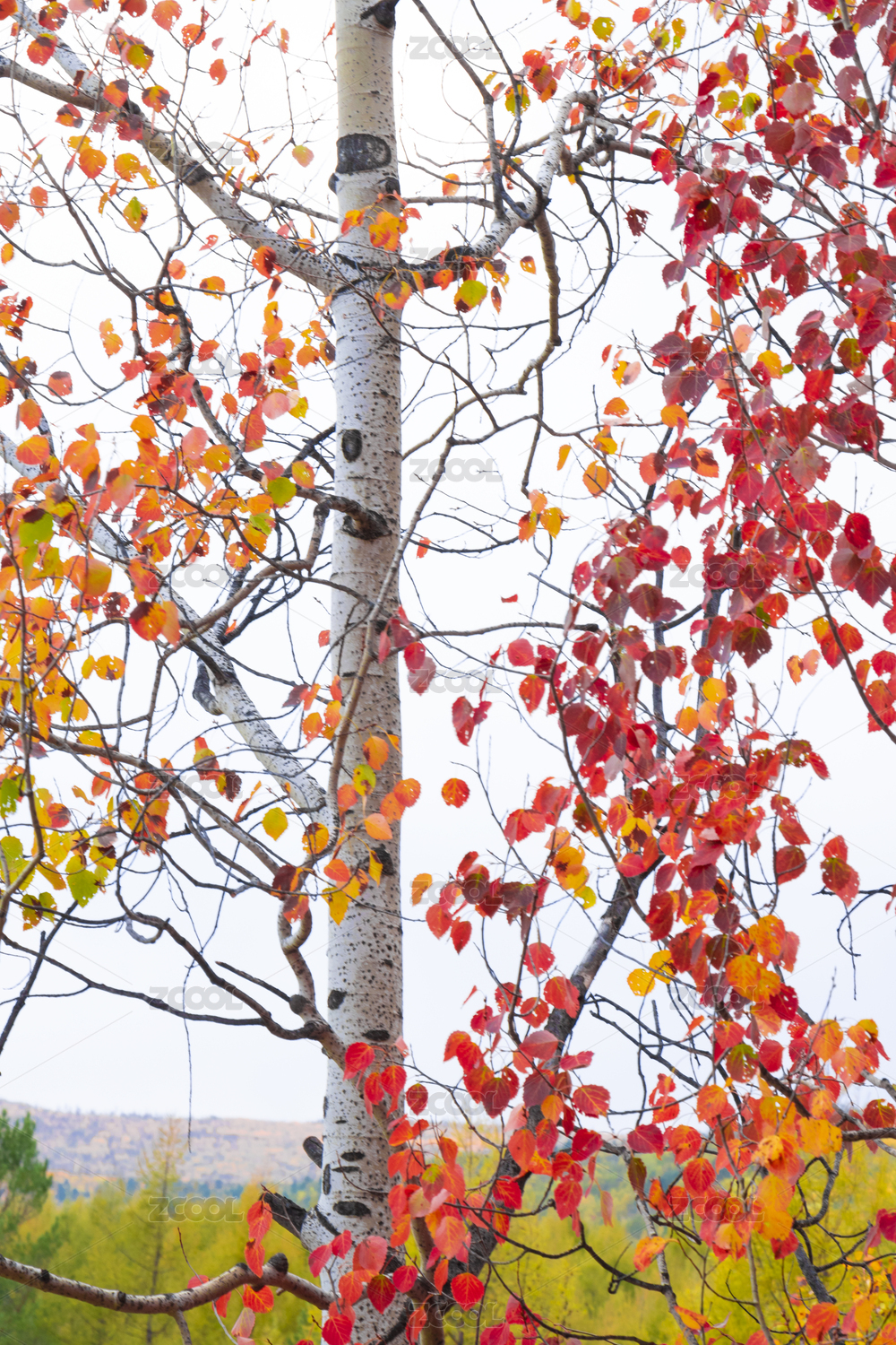 吉林蛟河红叶谷白桦树和红叶景观