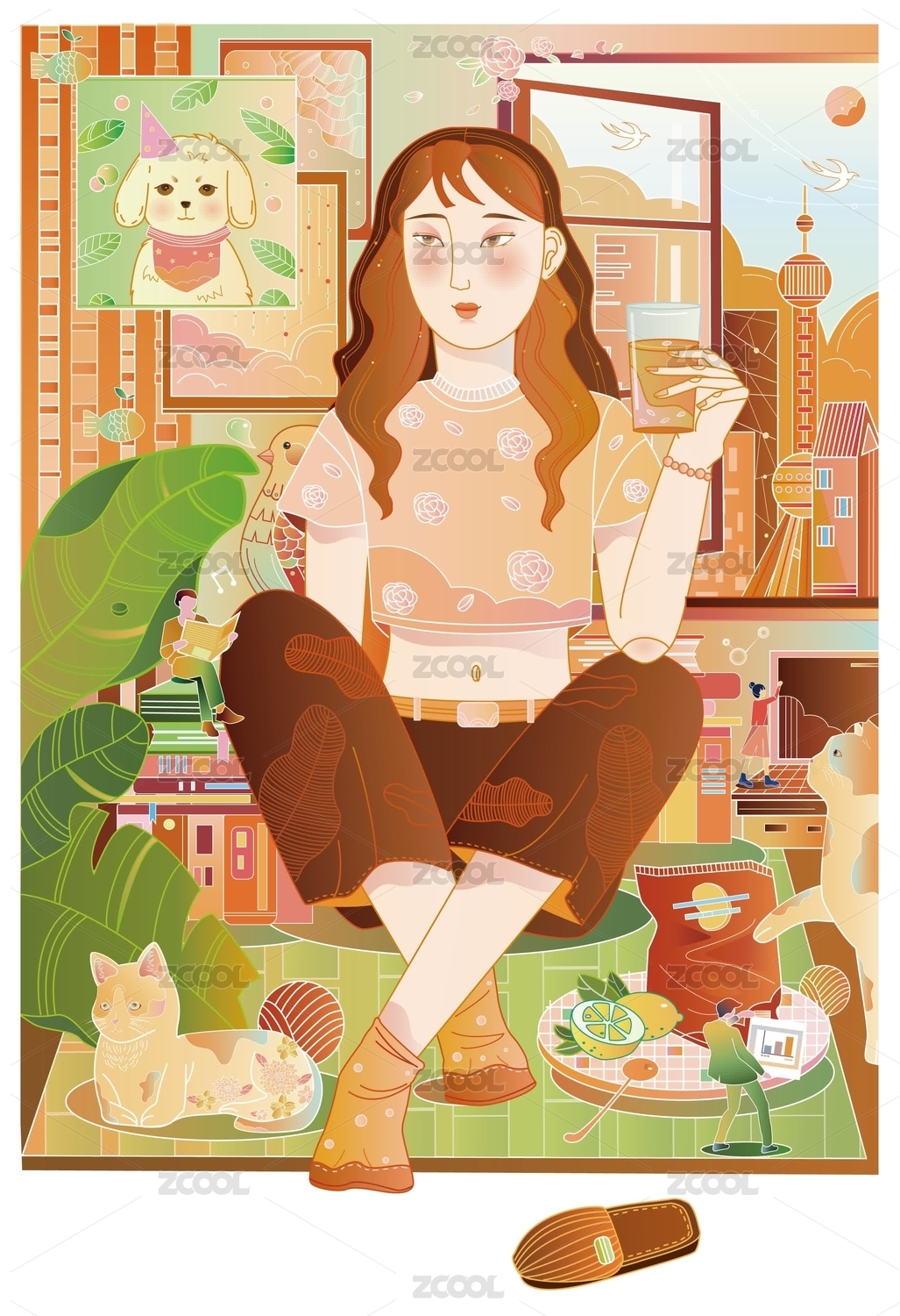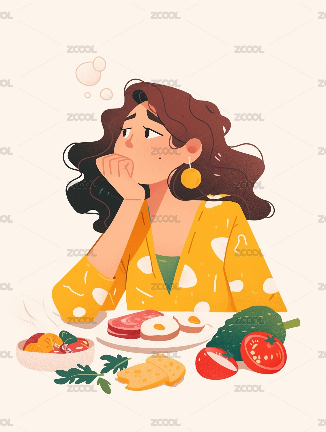 吃沙拉和牛奶的女孩和吃猫粮的橘猫