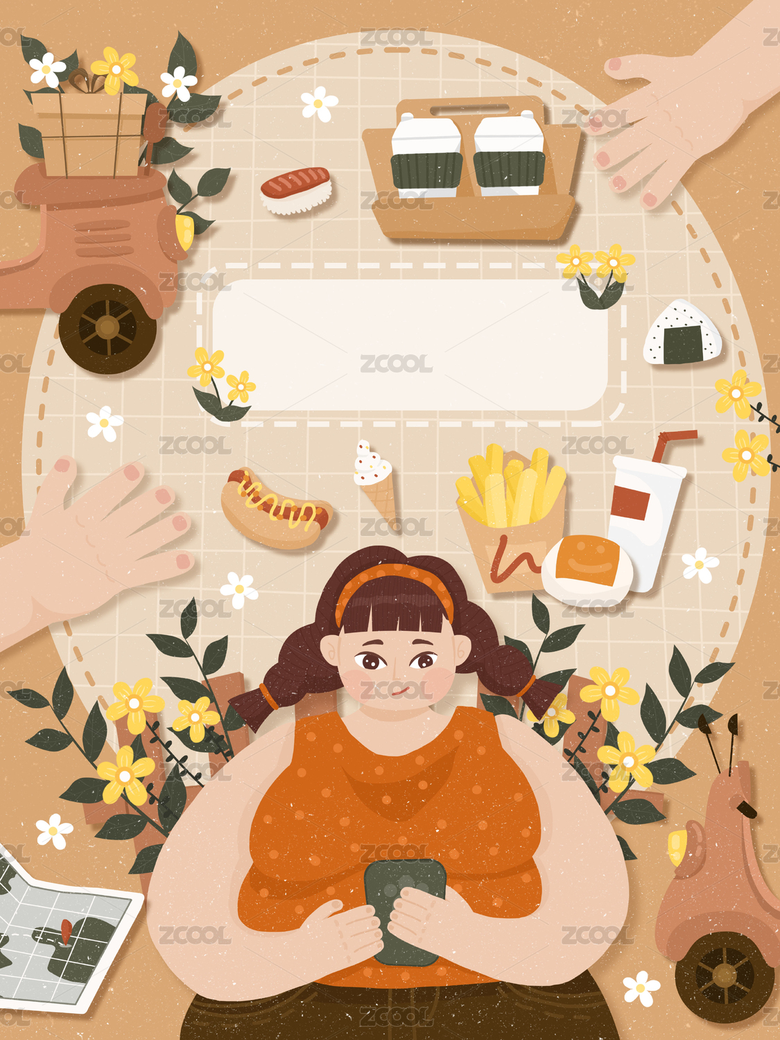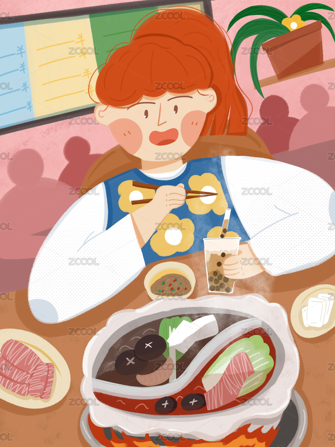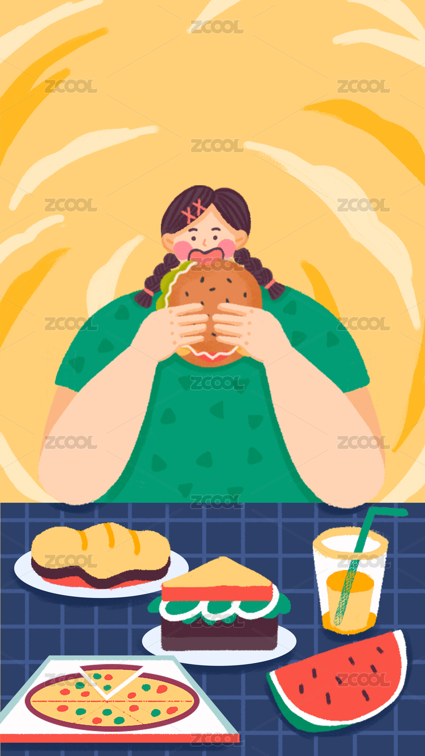 吃货女孩坐在桌子旁吃鸡腿蛋糕火锅等美食