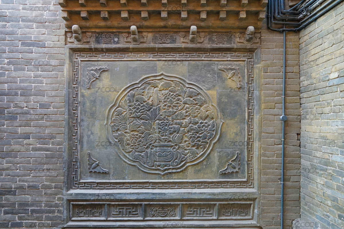山西省平遥古城清代古民居马家大院内的灰砖墙砖雕