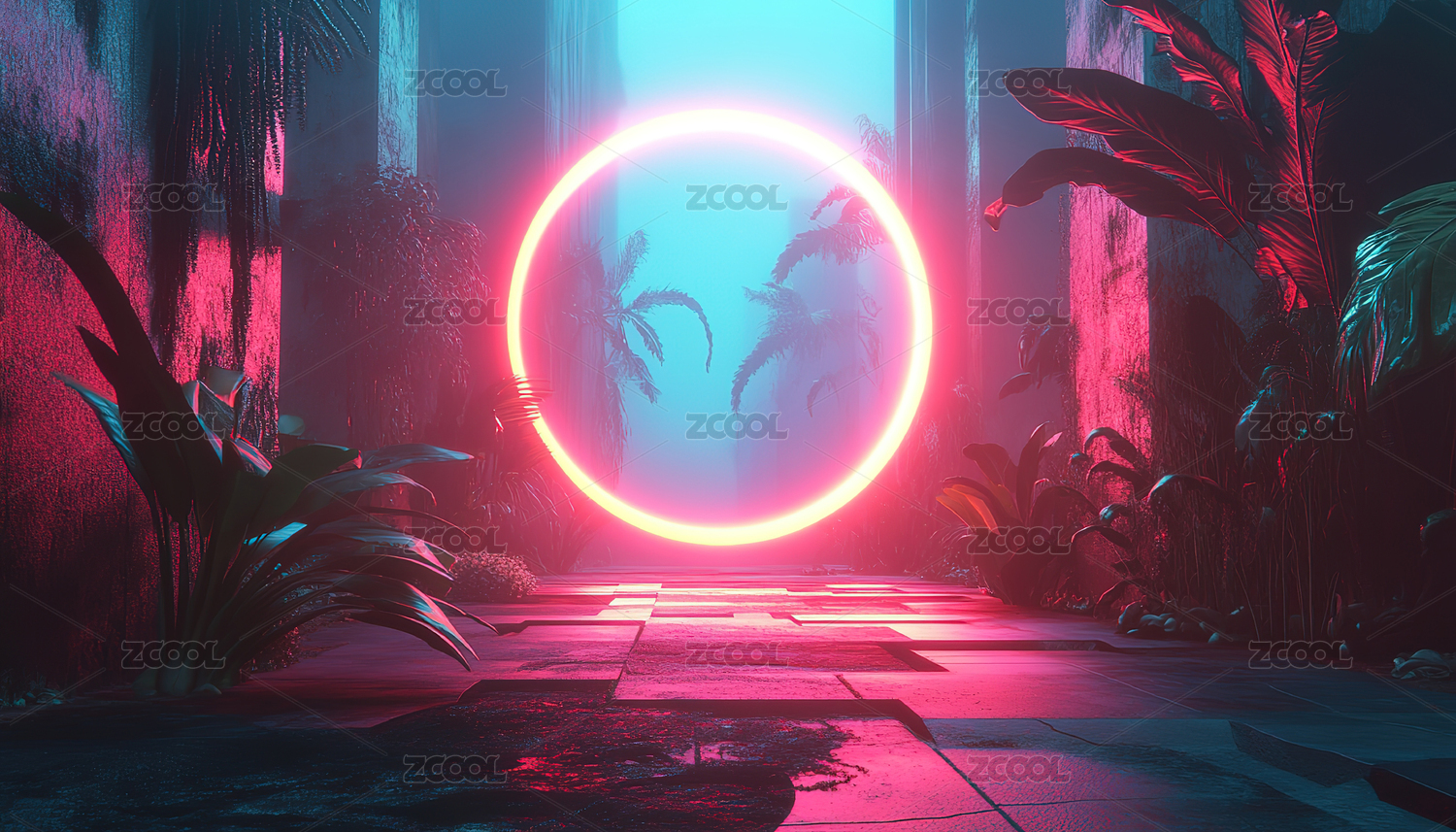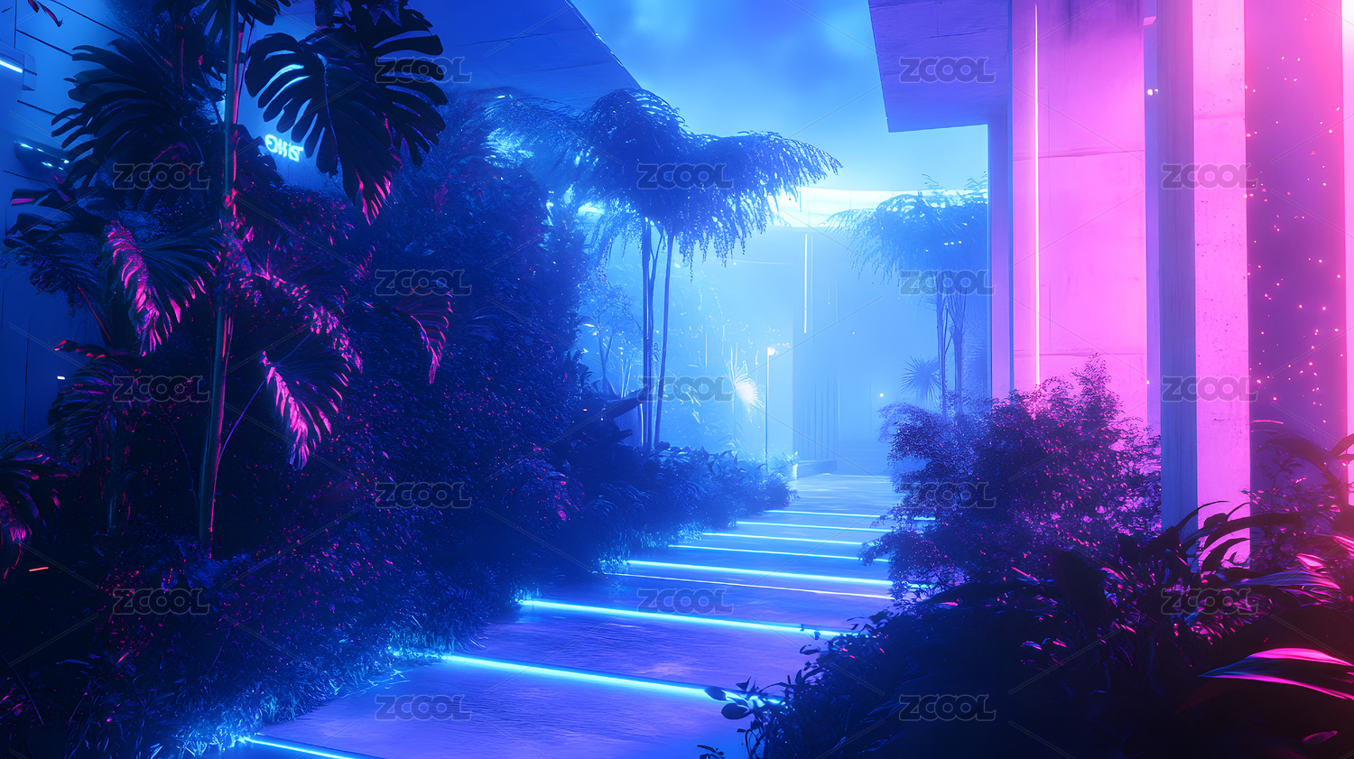 AIGCFG,赛博朋克,霓虹,彩色,渐变,科技,未来,虚幻,空间,植物