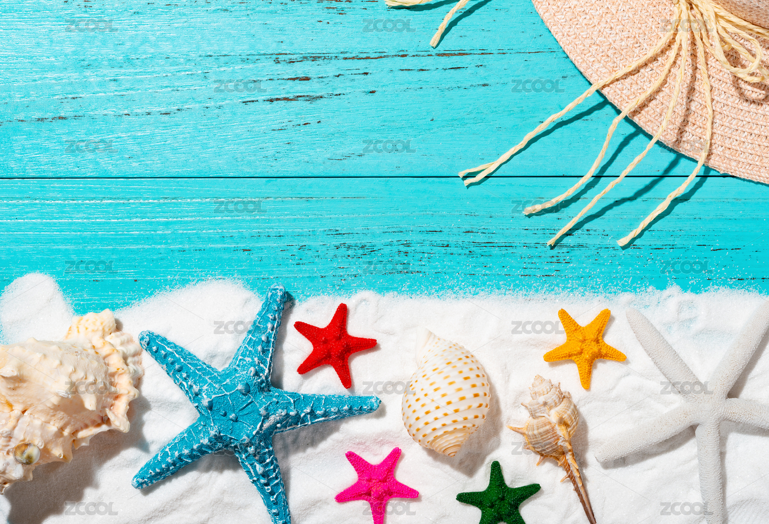 夏天海滩海星草帽背景