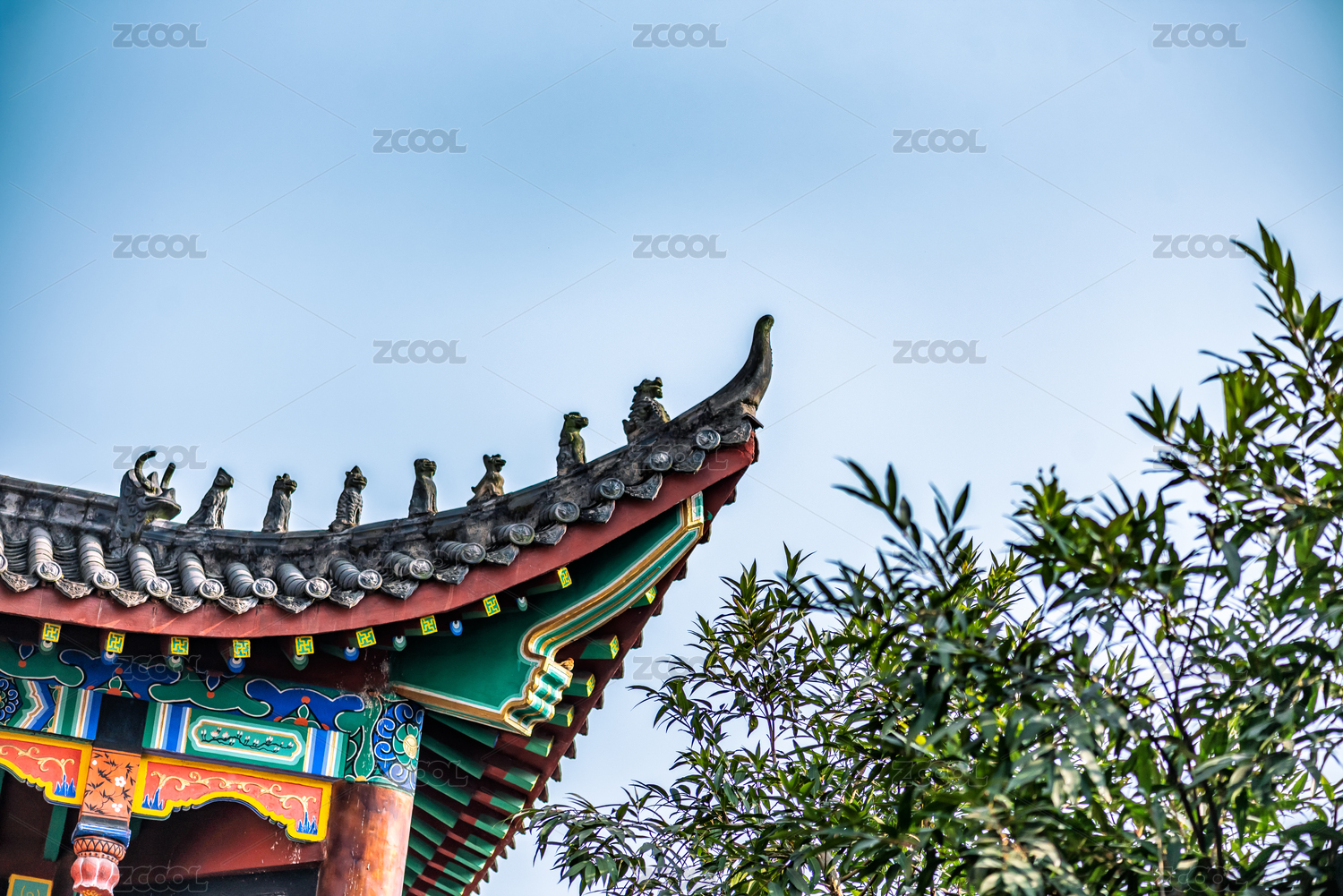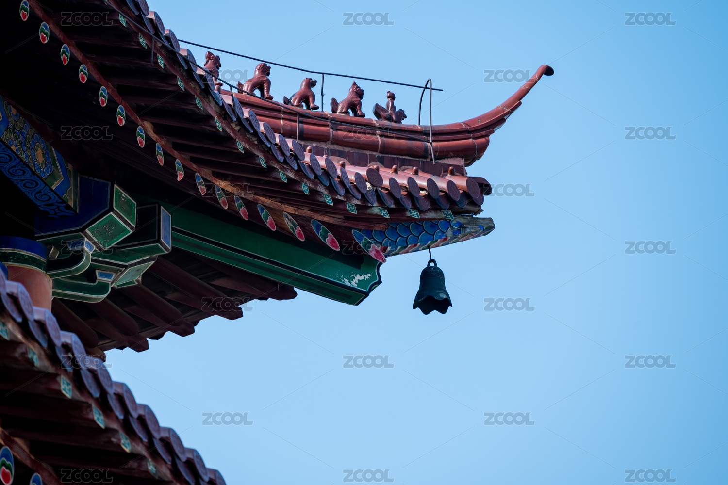 西安广仁寺传统建筑飞檐上的脊兽和风铃
