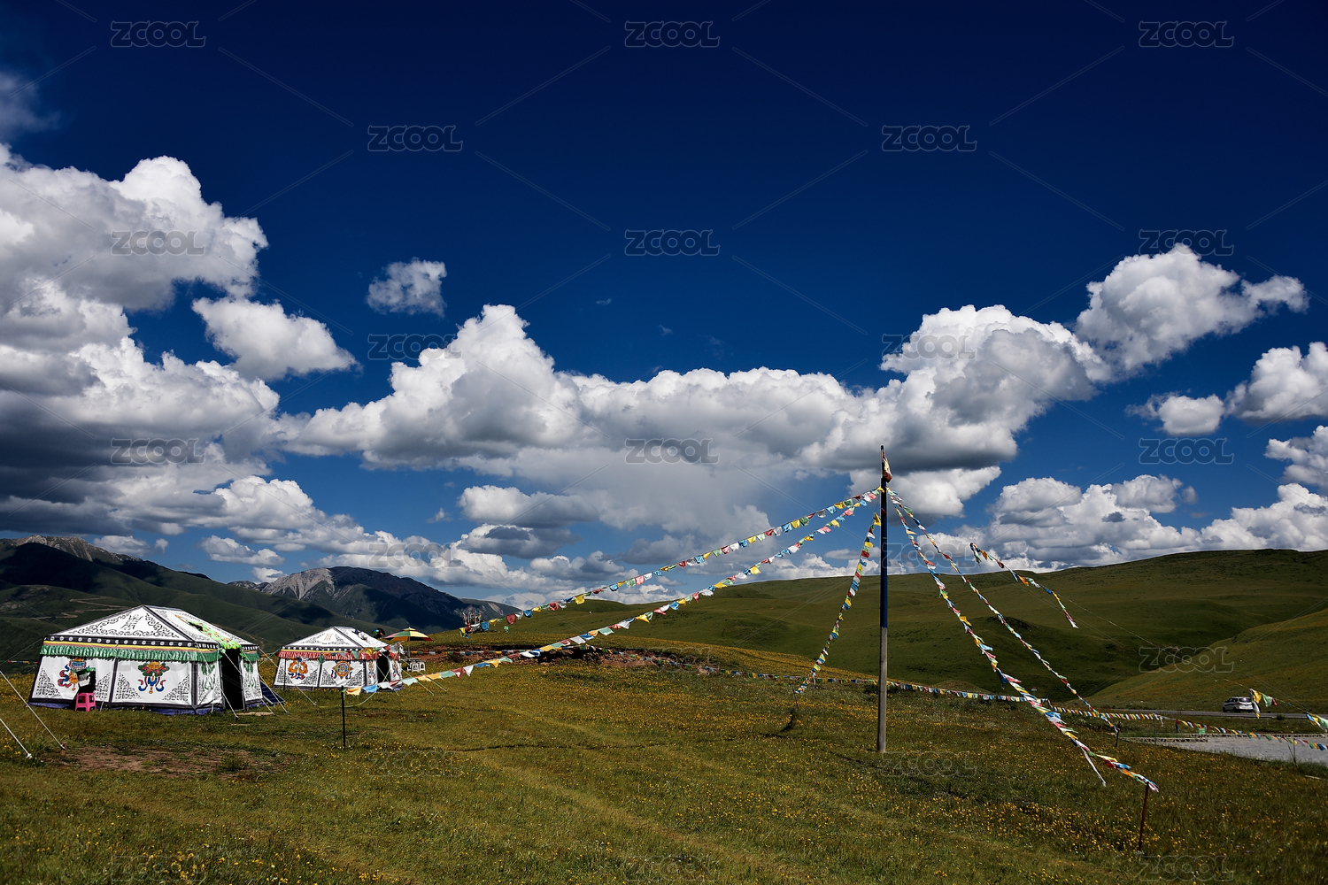 甘肃南部桑科草原牧民帐篷和牦牛群