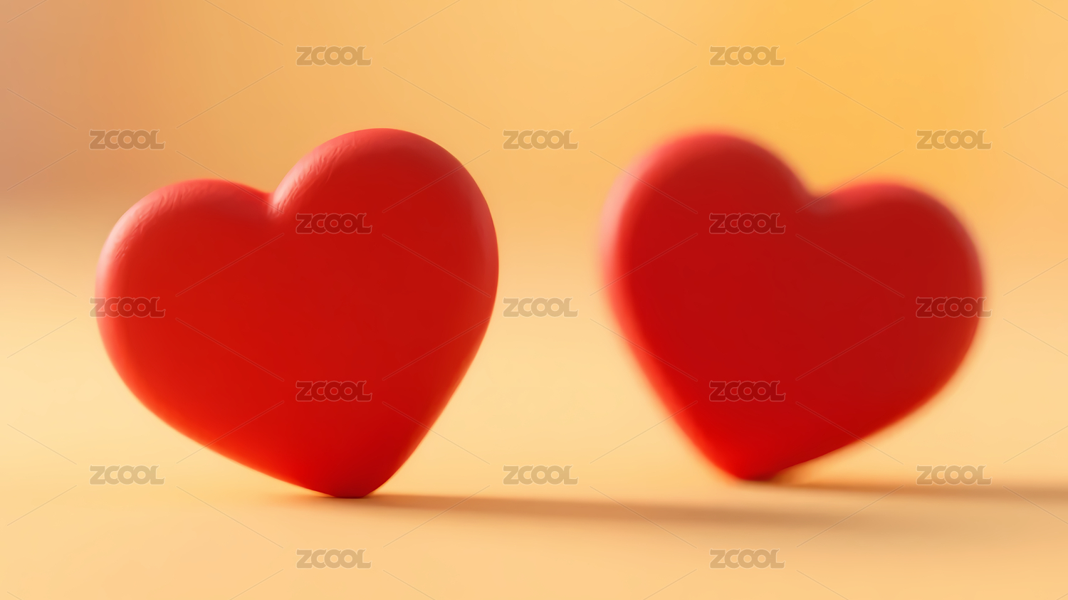 四个红色绒面质感心形漂浮在柔和米色背景上
