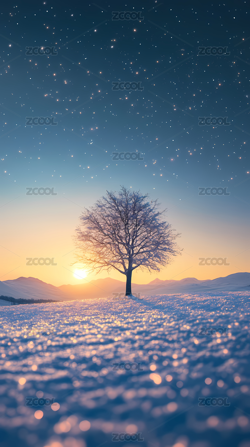 冬日雪景中粉色树木,星光闪烁