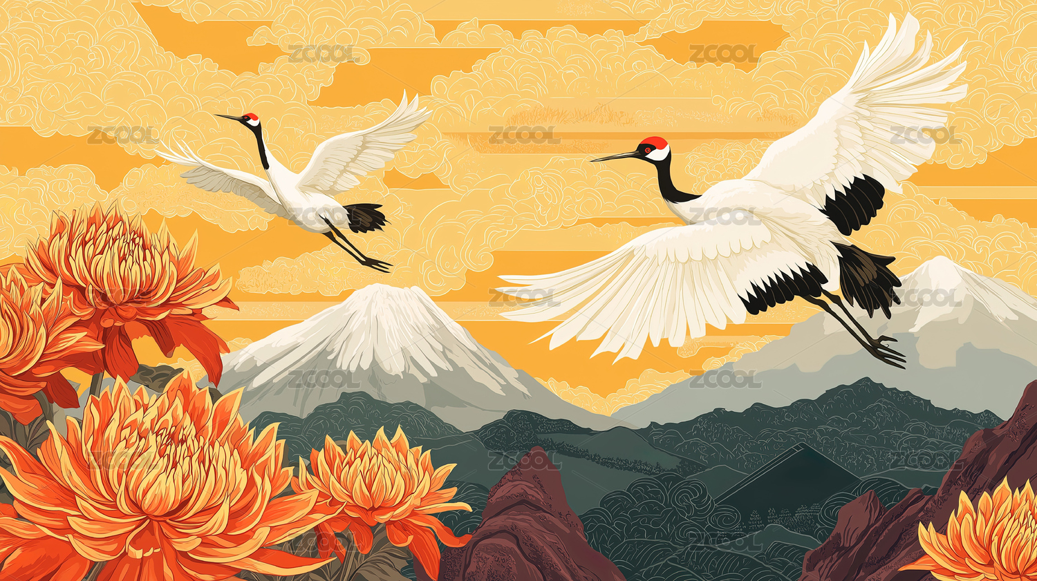 AIGC202406,仙鹤,山水画,剪影风格,远山,菊花