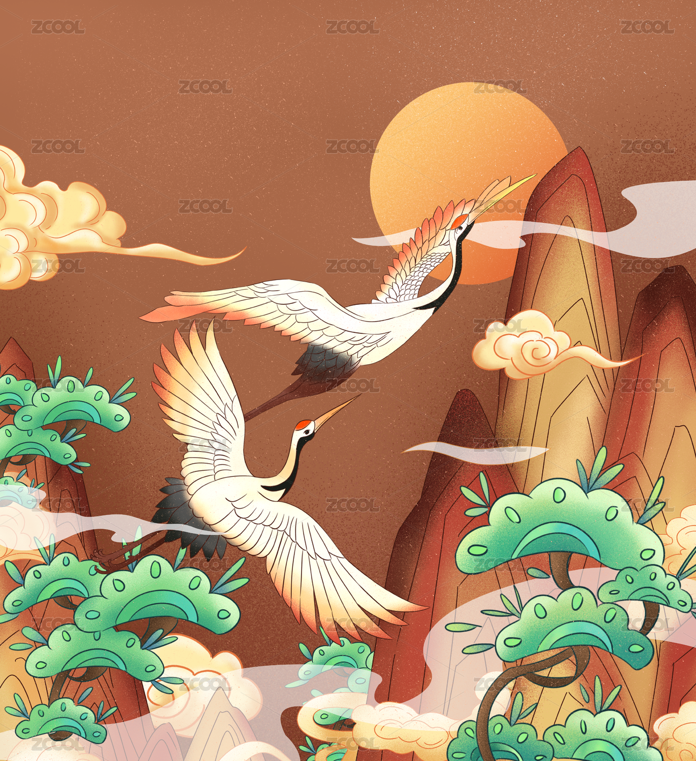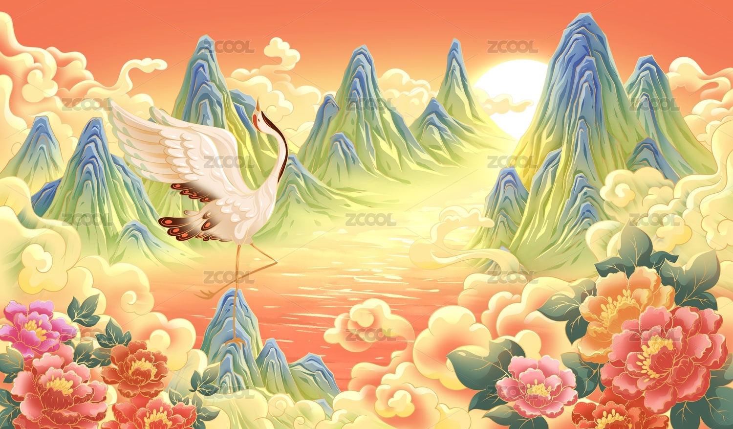 牡丹仙鹤山水国潮插画