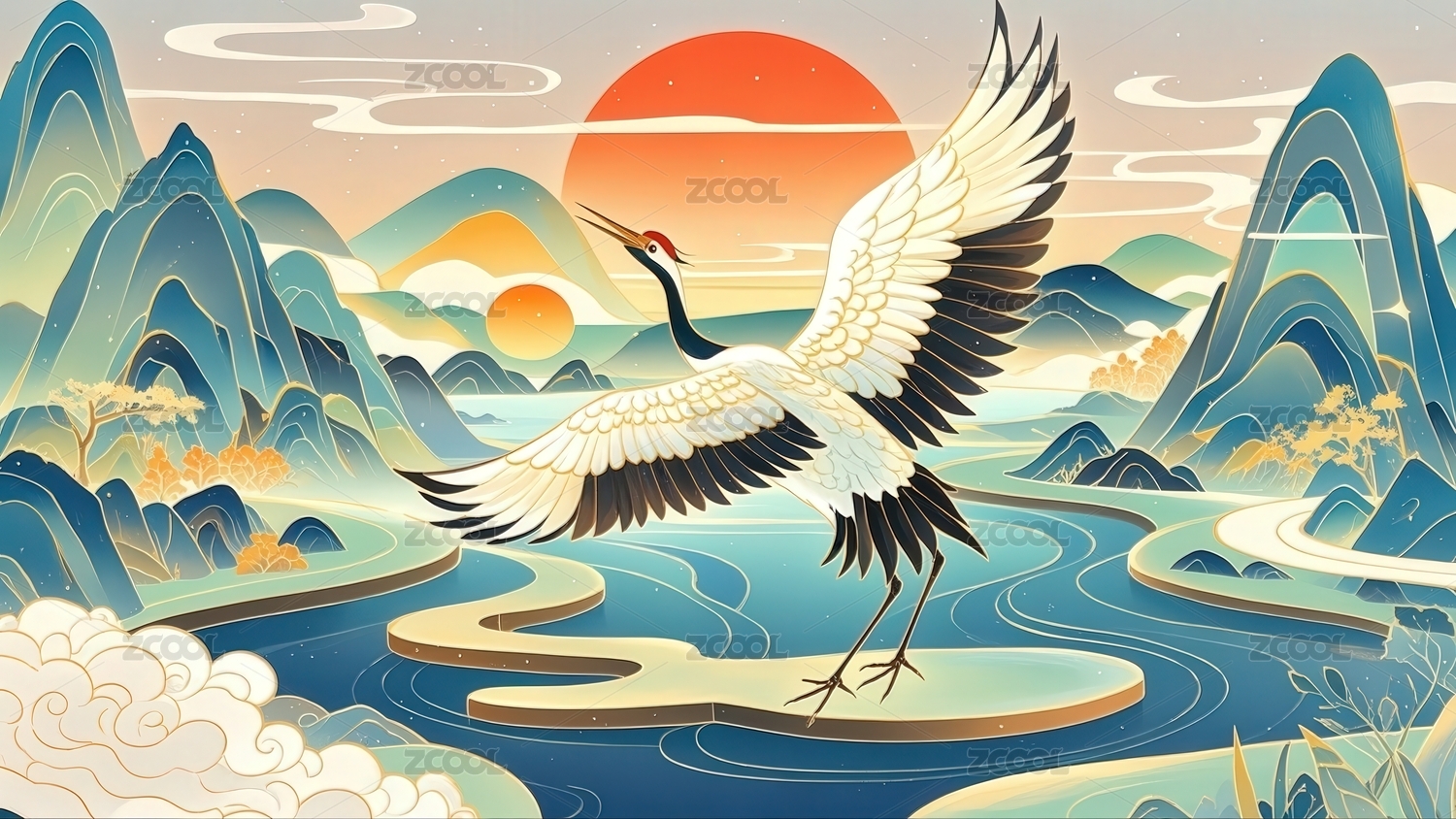 丹顶鹤与山水日出
