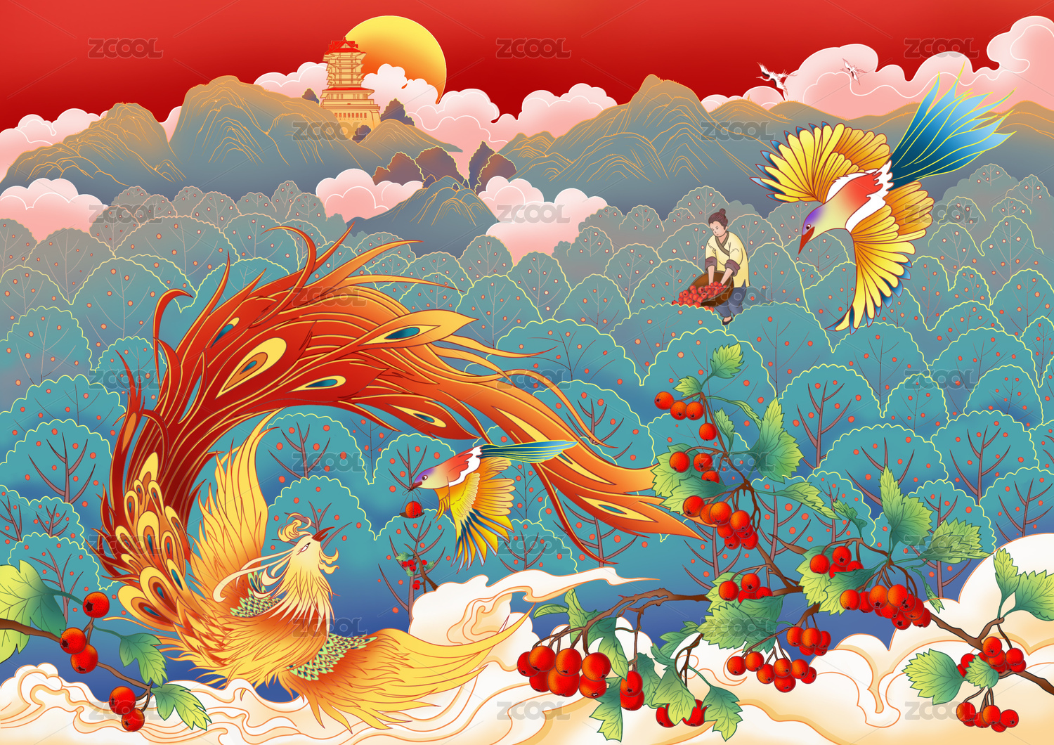 国风云海仙境凤凰舞壁纸