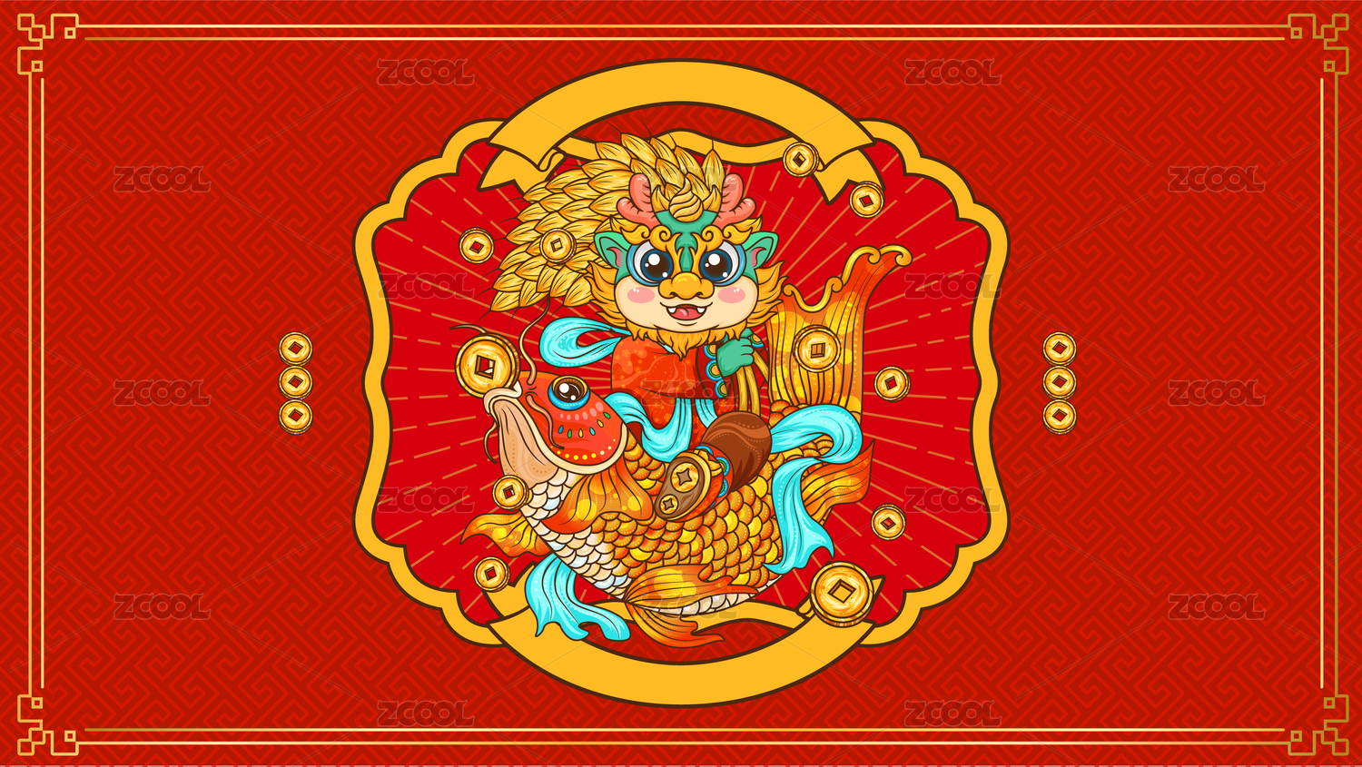 龙年聚宝盆红鲤鱼红包灯笼卡片边框