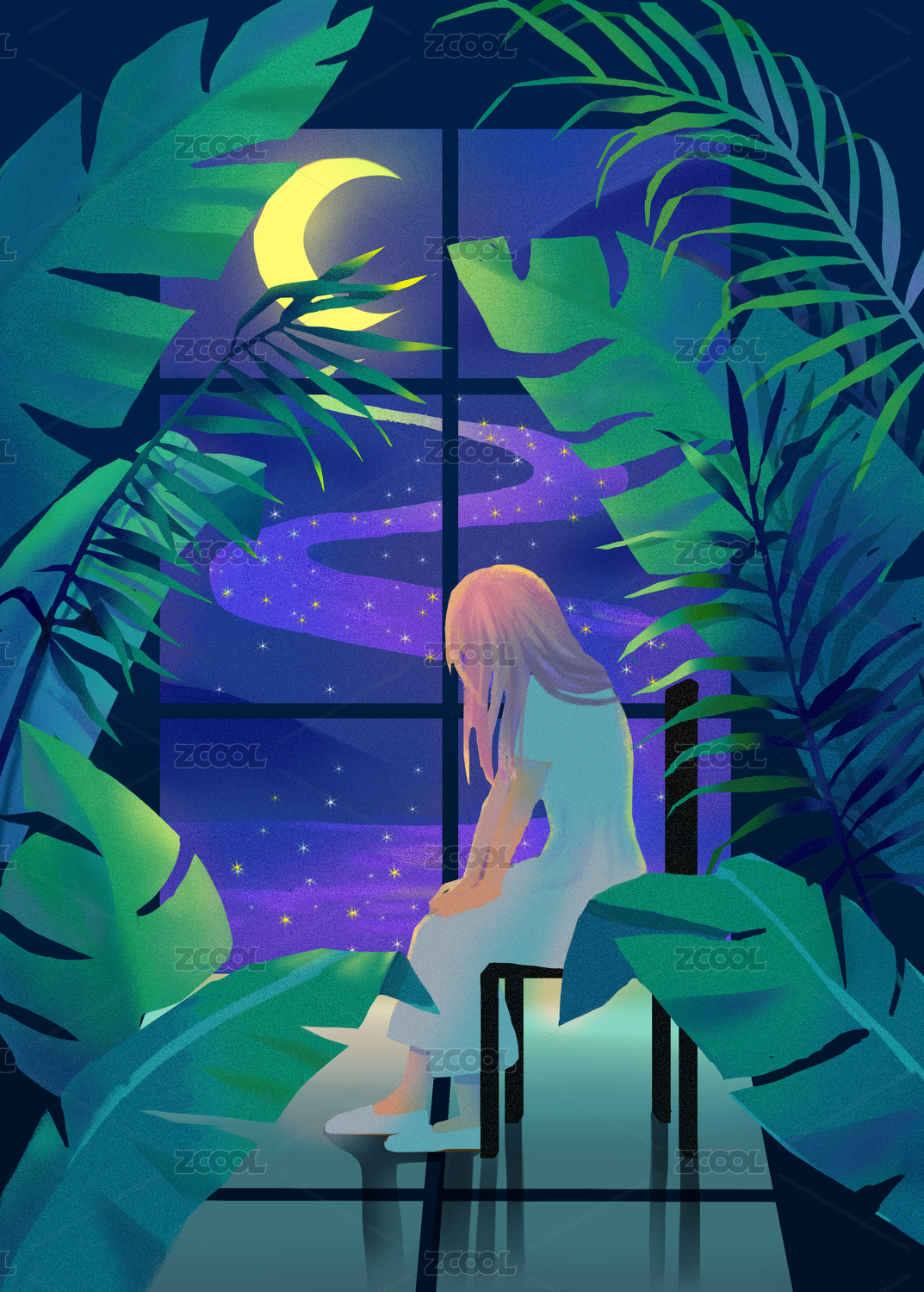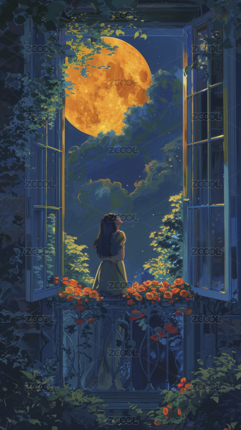 月夜窗边少女的凝视