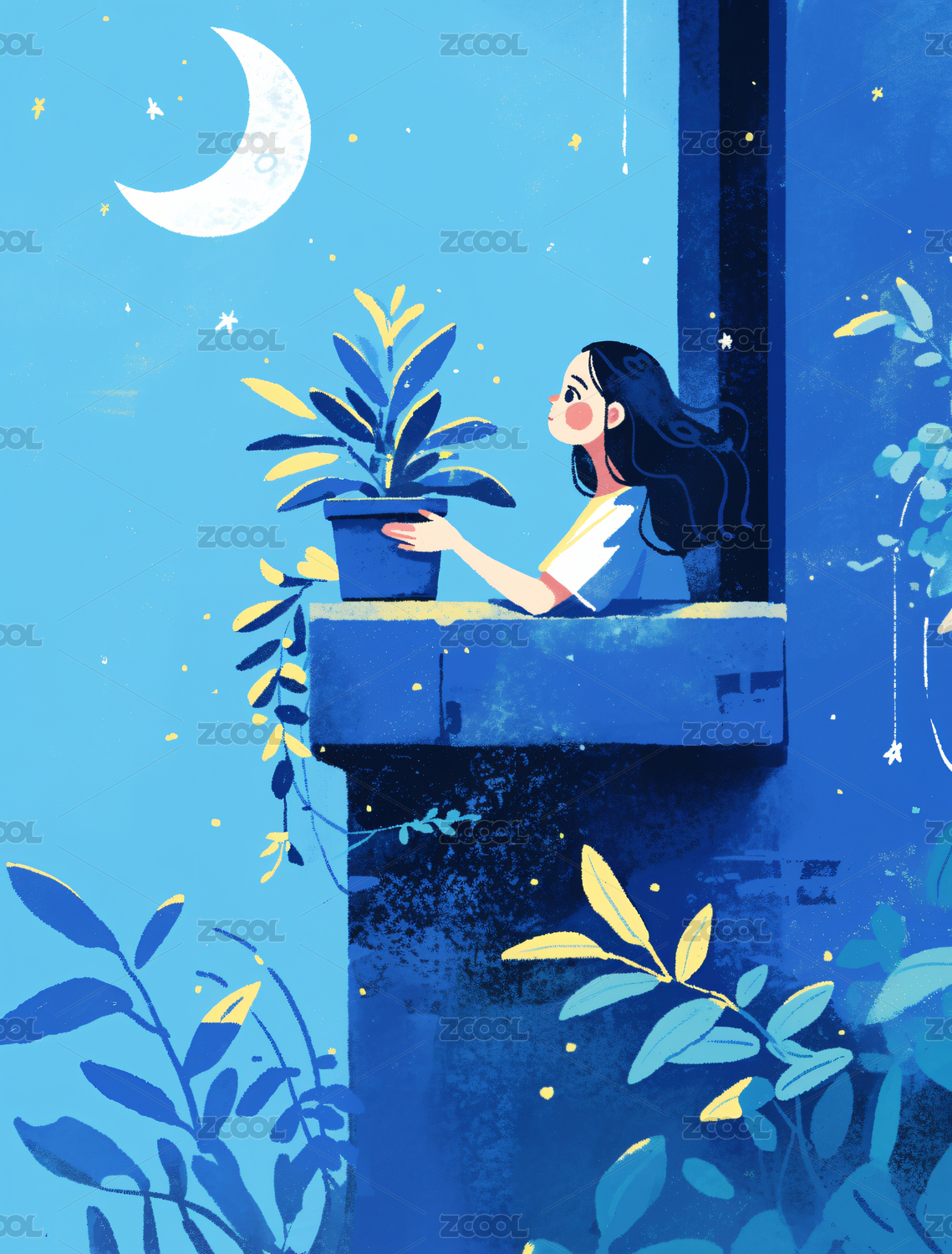 夜晚女孩坐在月亮星空下手绘插画