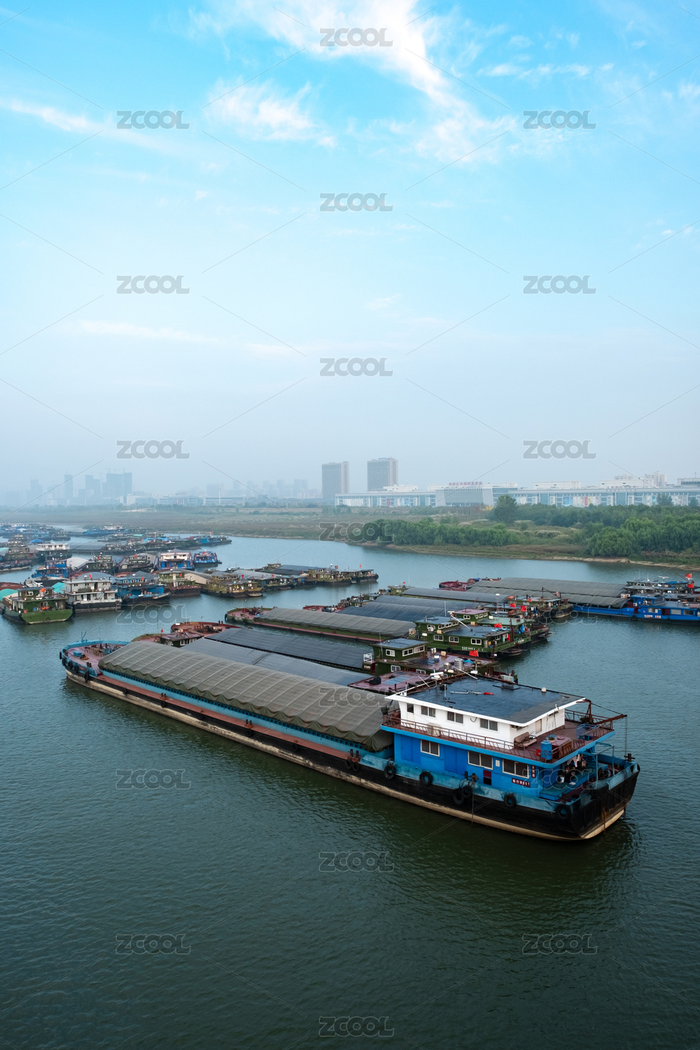 夏日俯瞰停靠在淮河的中国安徽省蚌埠市多艘渔船