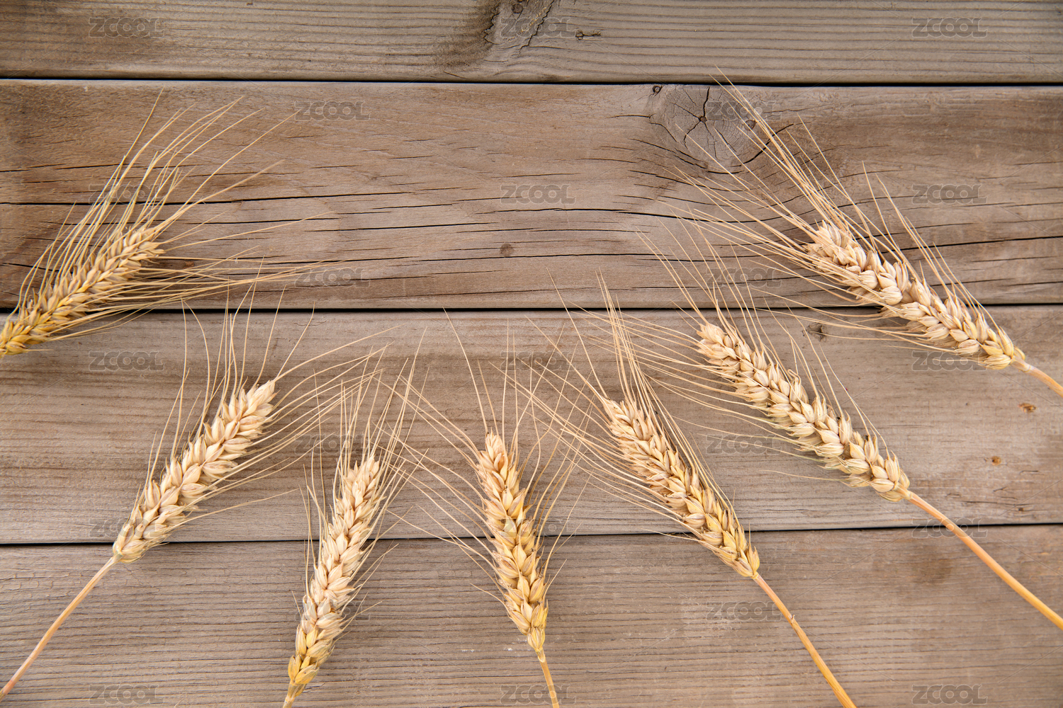 古旧木板背景上摆放整齐的金黄色的麦穗