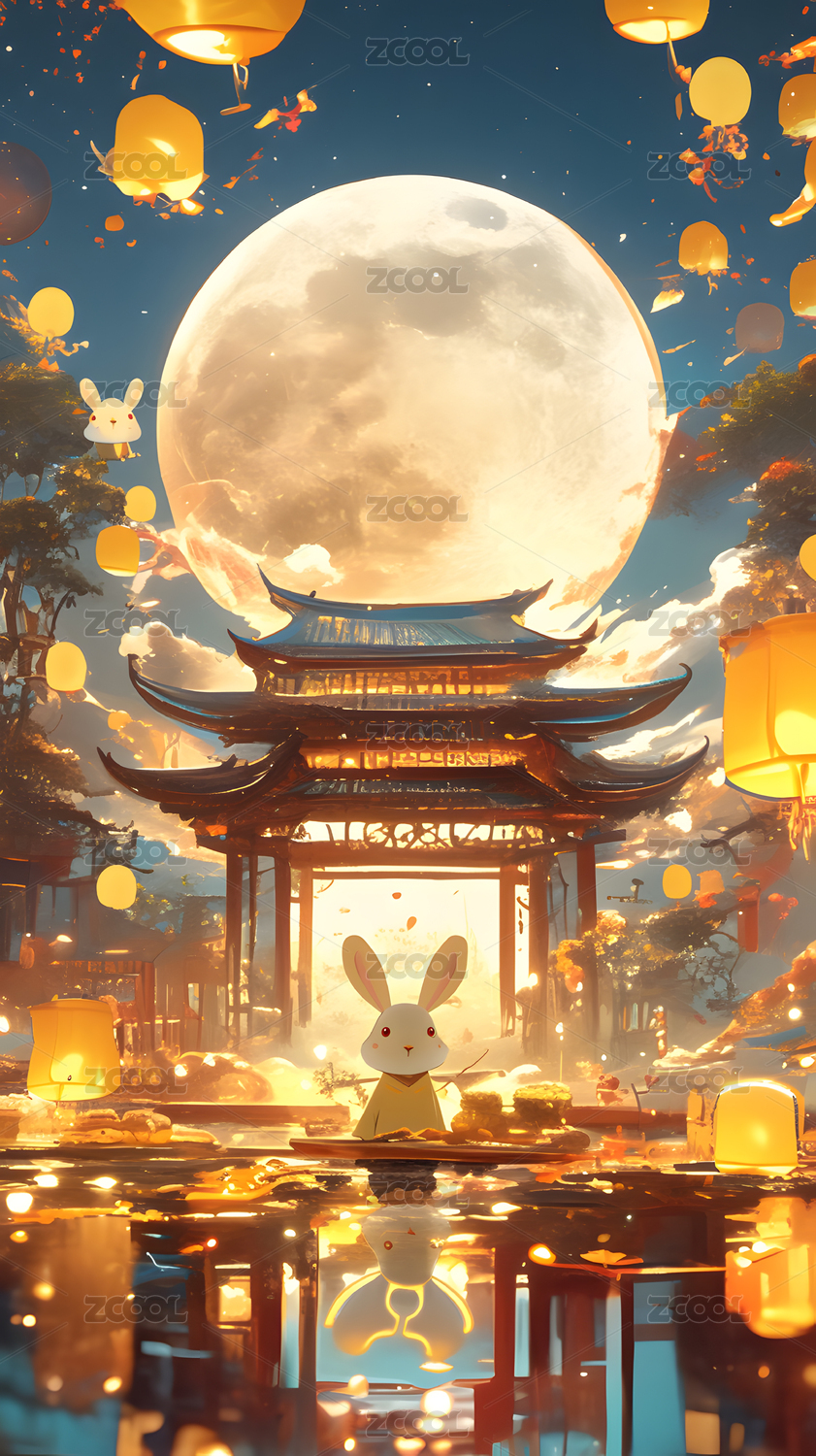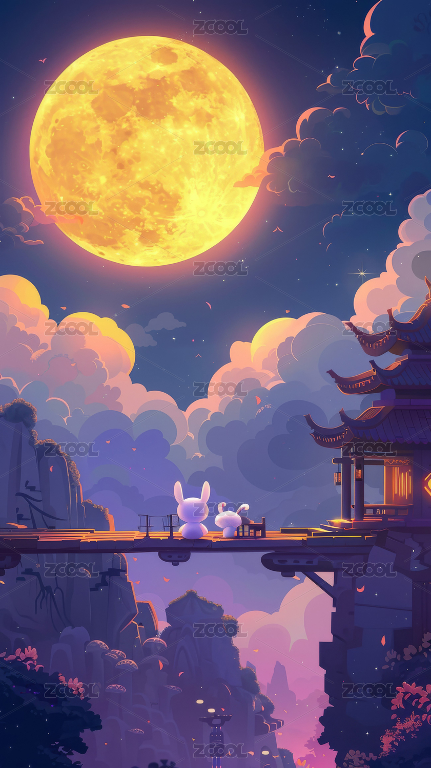 AIGC202403,月亮,传统,文化,中秋节,节日,插画,兔子,月兔,插图