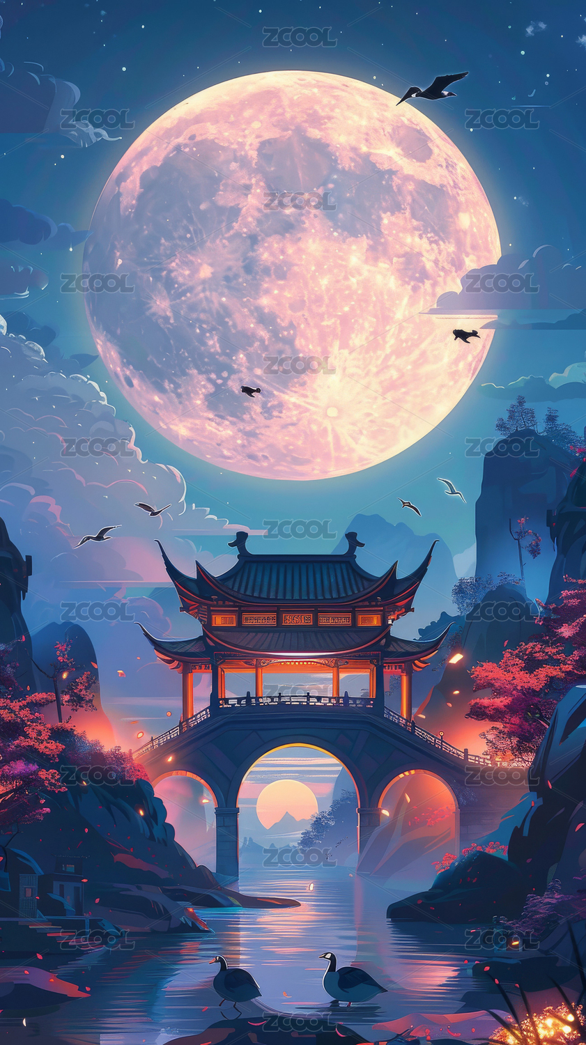 中秋古韵夜景插画