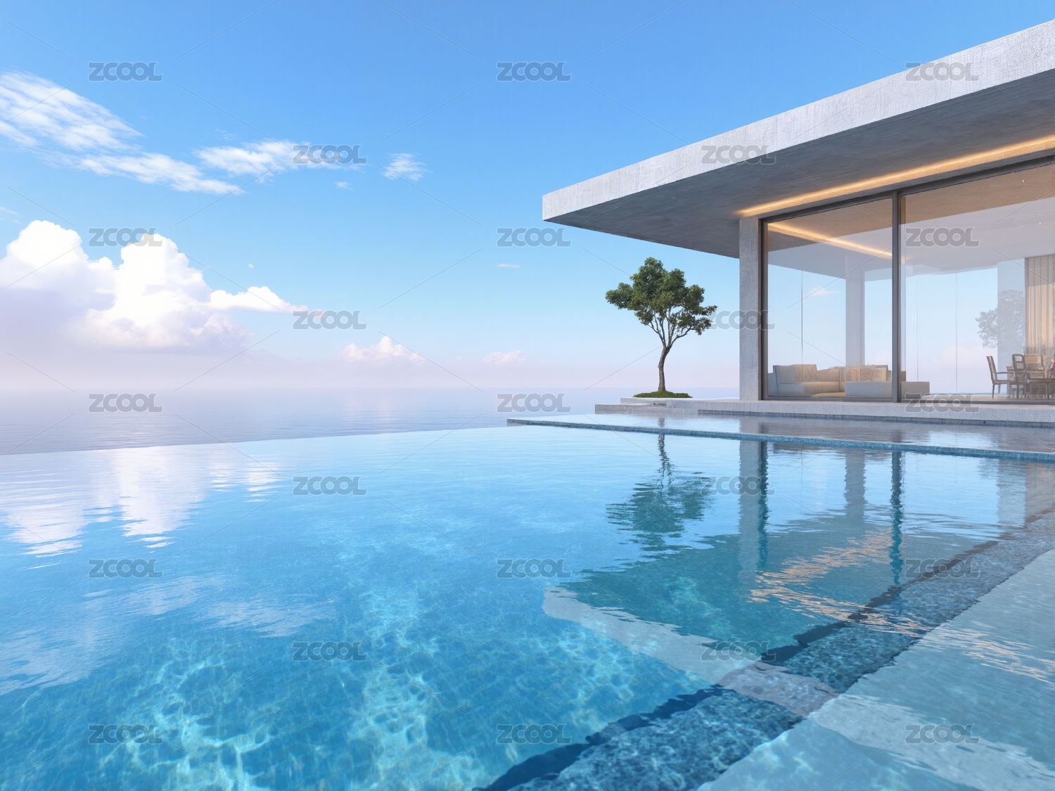 夕阳下的别墅海边现代建筑内部景观无边泳池